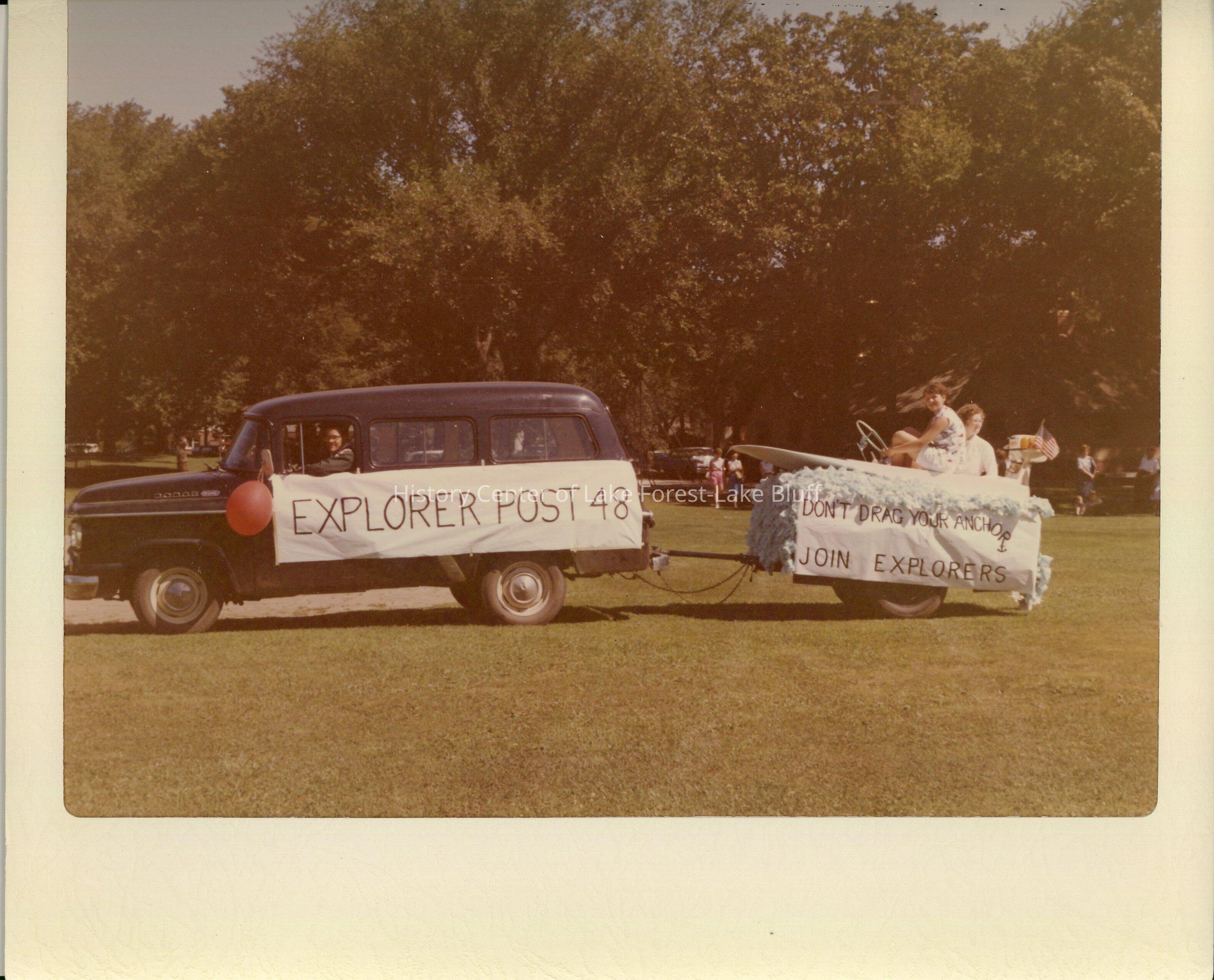 An old station wagon pulls a float that reads "Explorer Post 48: Don't Drag Your Anchor, Join Explorers"