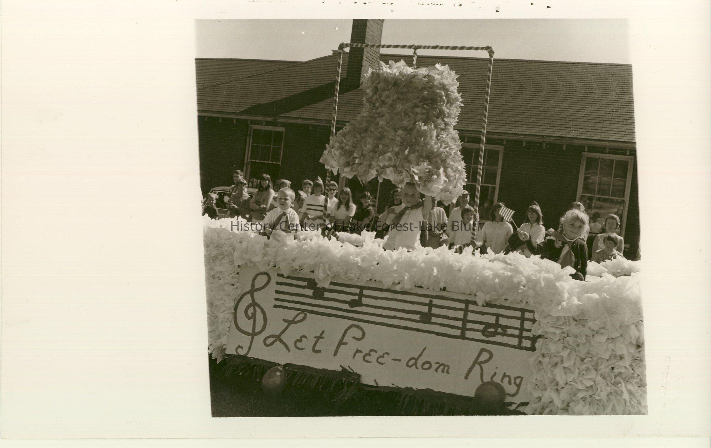 Children ride in a float with a sign reading "Let Freedom Ring"
