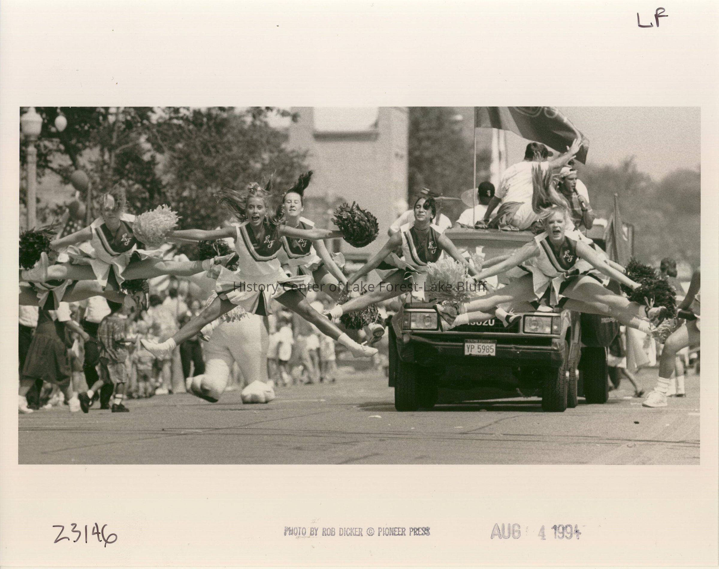 The Lake Forest High School cheerleaders perform acrobatics along the route. August 4, 1994.