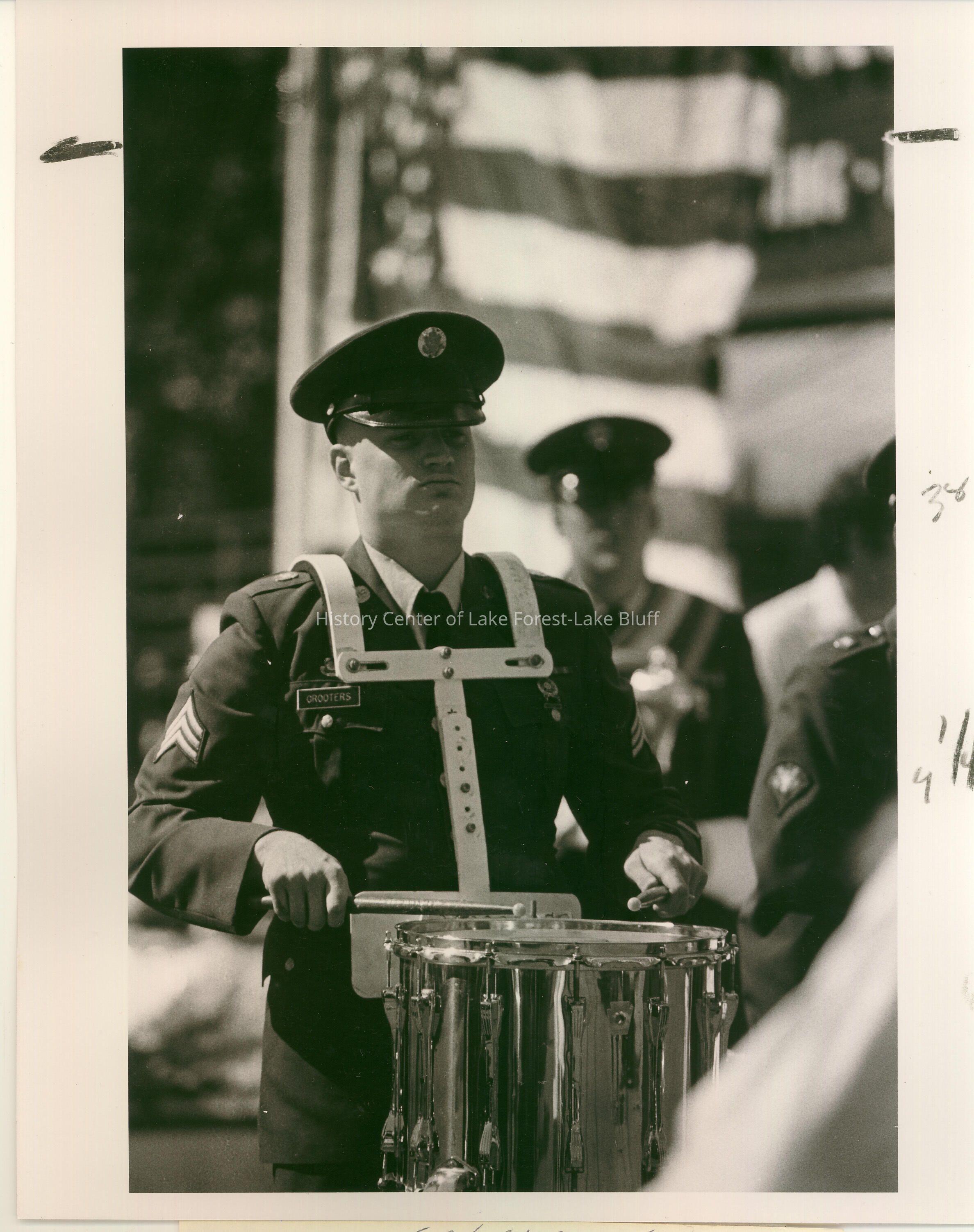 At Lake Forest Day Parade: Drummer from Fourth Army Band at Ft. Sheridan practices while waiting to march in parade