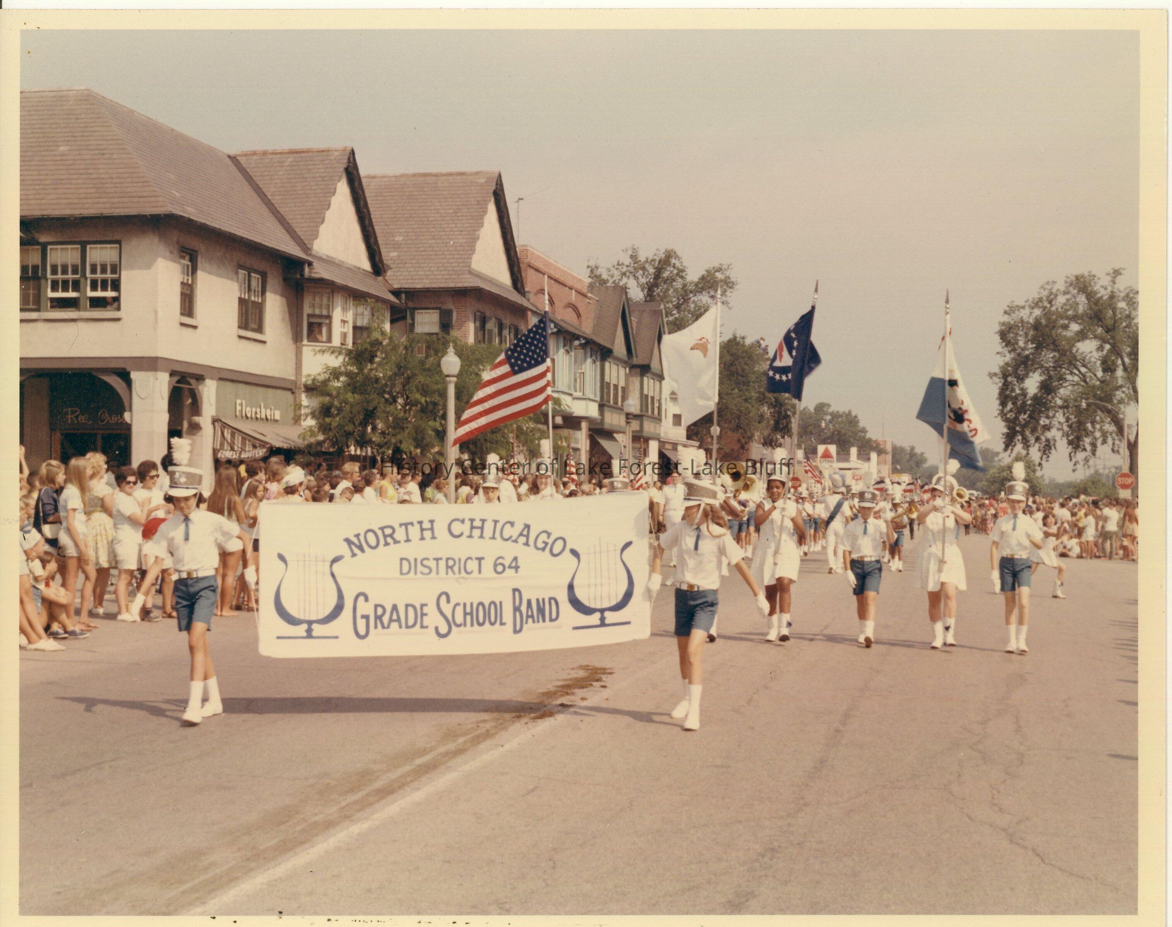 North Chicago District 64 Grade School Band marches in a Lake Forest parade marching down Western Ave. Lake Forest Bootery and Florsheim is viewable in the background.