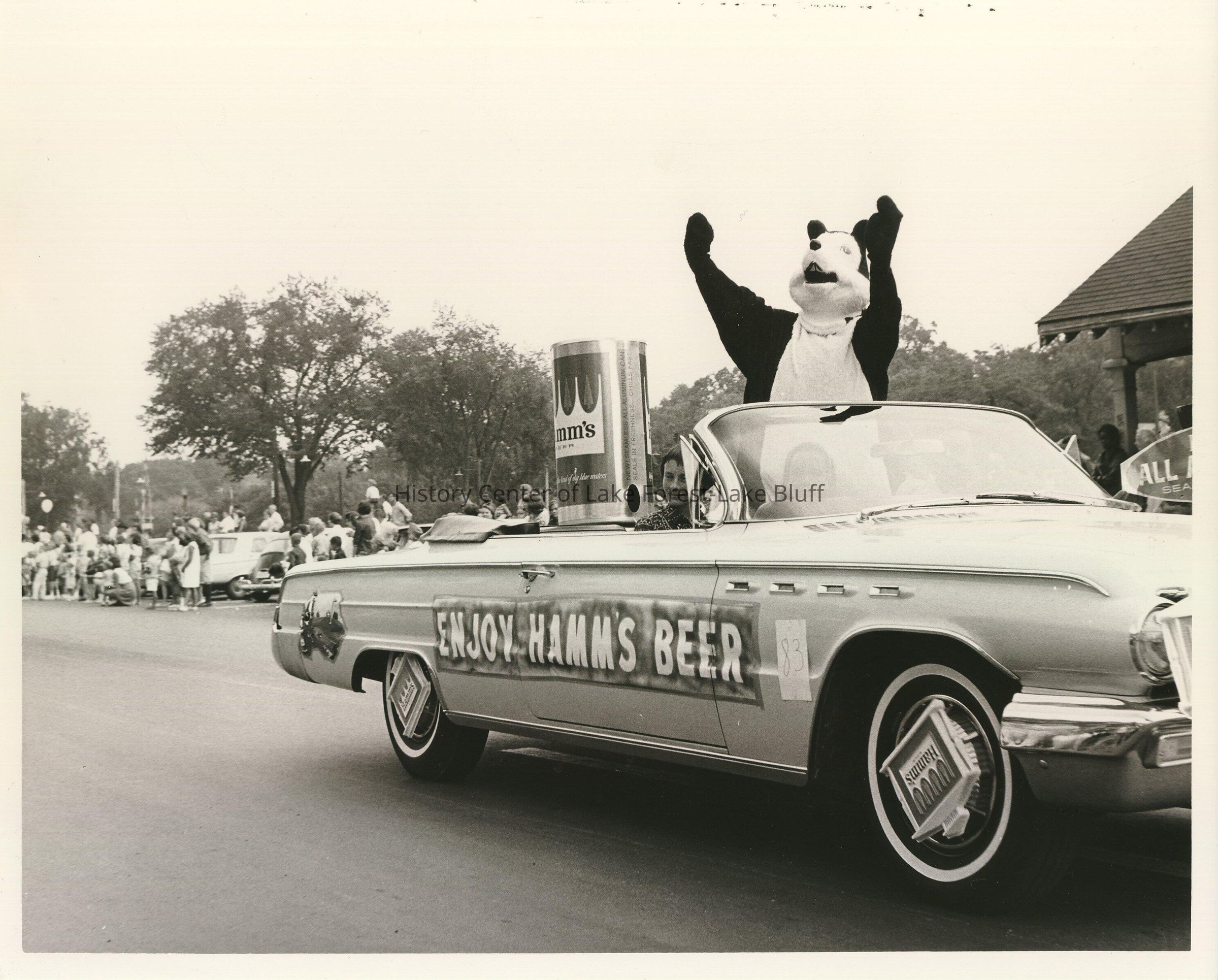 A float carrying a mouse mascot and a sign that says "Enjoy Hamm's Beer" passes by the Lake Forest train station.