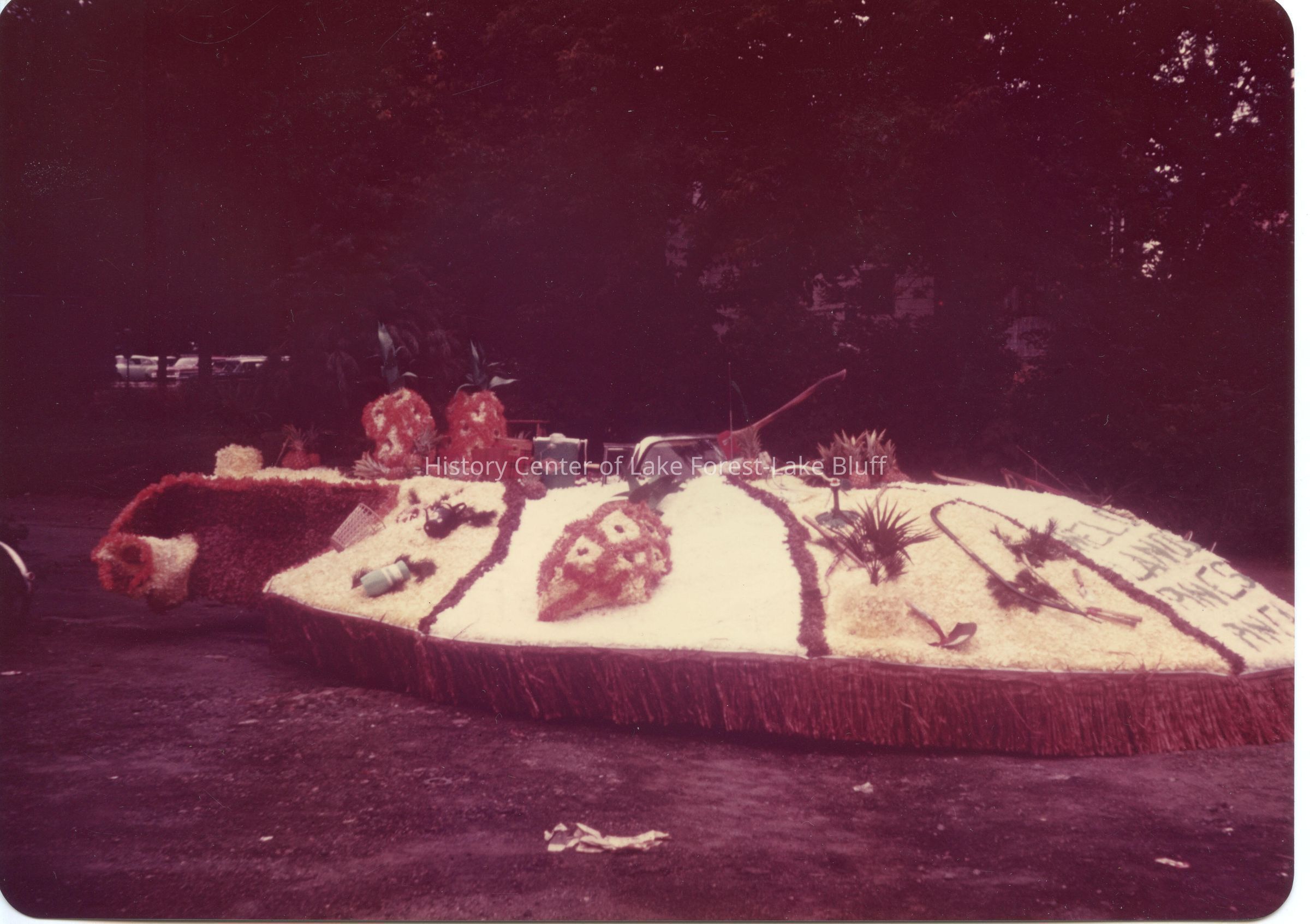Kodachrome enlargment dated August 1961. Envelope holding the photographs notes that it is Lake Forest Day 1960. O'Neill Hardware Float. "Welcome Lands of Pines and Pineapples." Float features large pineapples and ski eqipment.