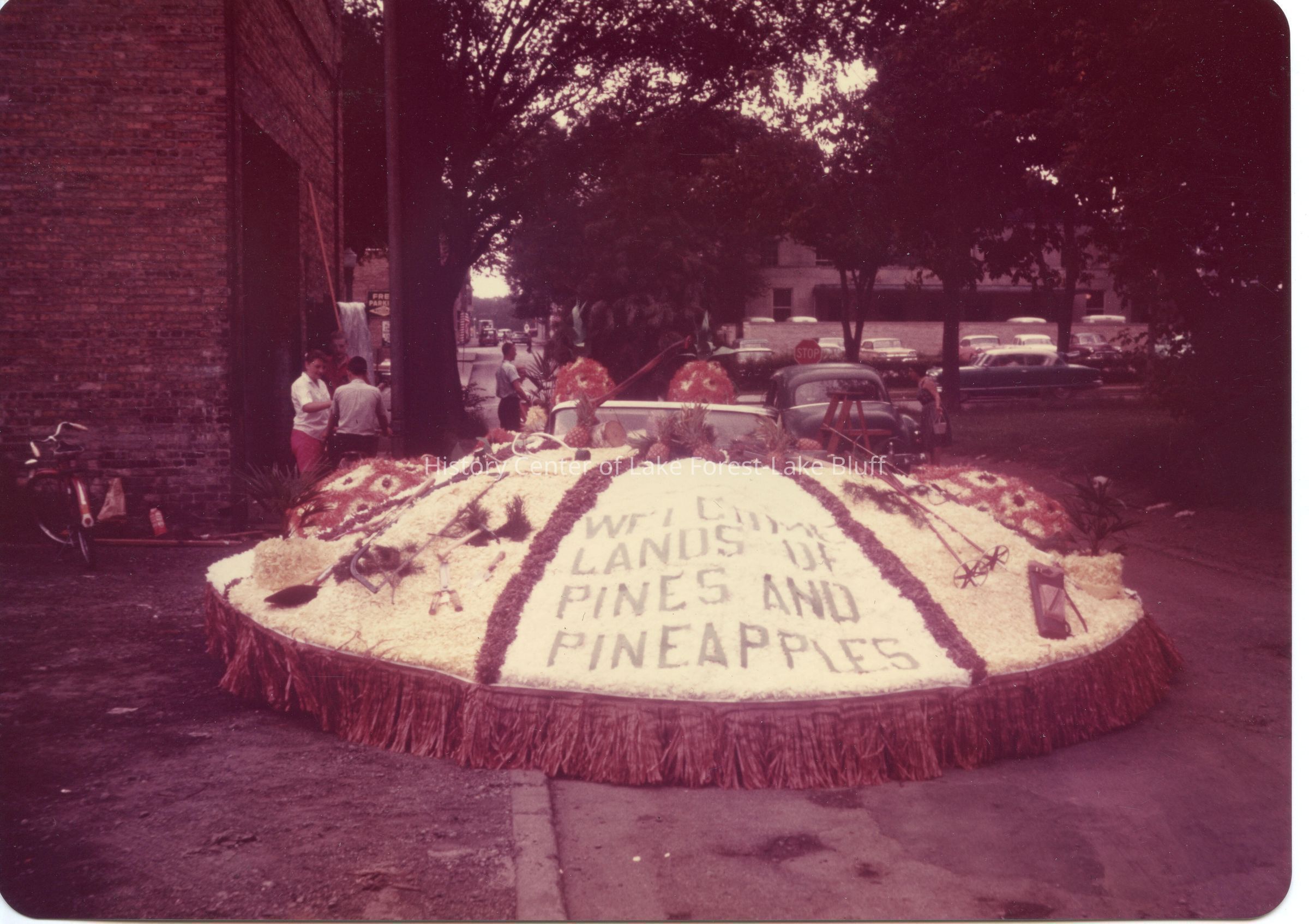 Kodachrome enlargment dated August 1961. Envelope holding the photographs notes that it is Lake Forest Day 1960. O'Neill Hardware Float. "Welcome Lands of Pines and Pineapples." Float features large pineapples and ski eqipment.. Lake Forest Day: 100 Years of Celebration, p. 62.