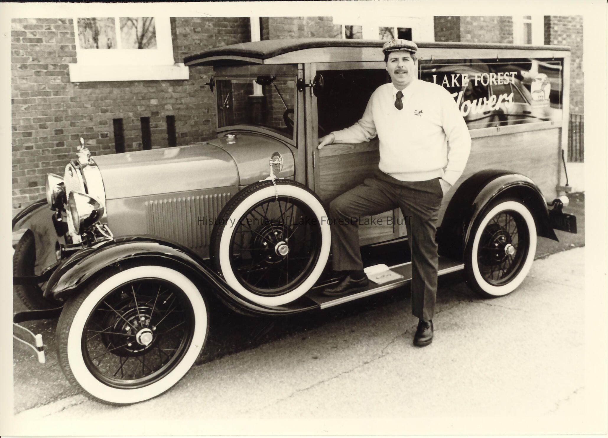 John A. Looby III stands in front of vintage car with "Lake Forest Flowers" on the rear window.