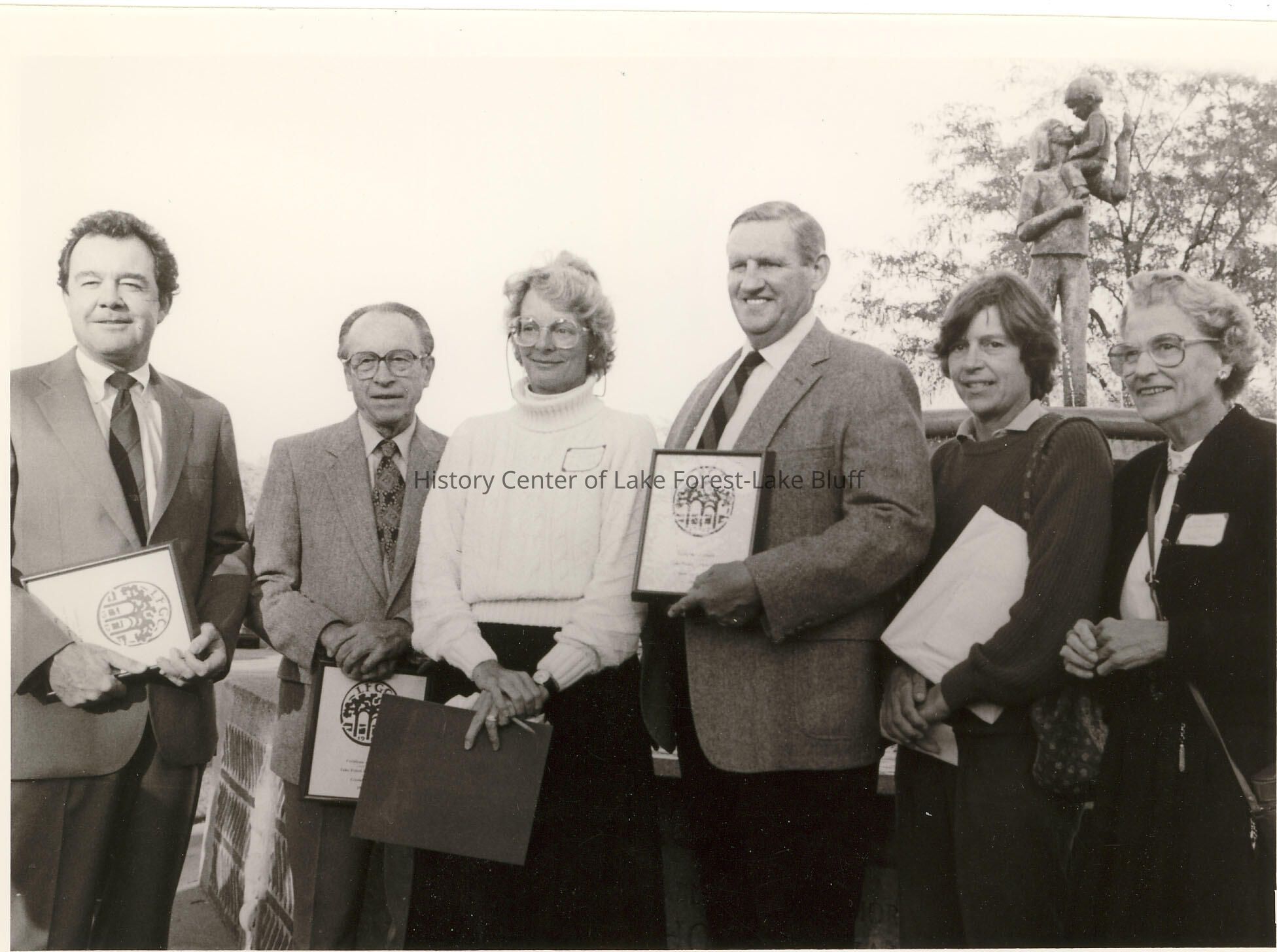 Lake Forest Garden Club Bob Harbour, Ed Szymanski, Linda Taylor, George Peter, Dee Dee Borland, Mary Oldberg, holding Certificates in front of fountain in Market Square