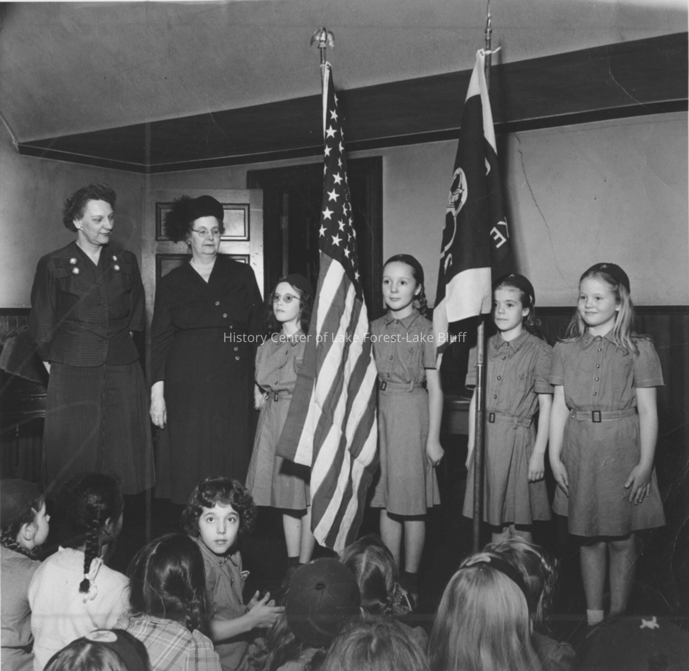Four Lake Forest Girl Scouts/Brownies, standing in a room at the American Legion next to the American and Girl Scout flags. Two women are standing next to them while other Brownies are seated on the floor.