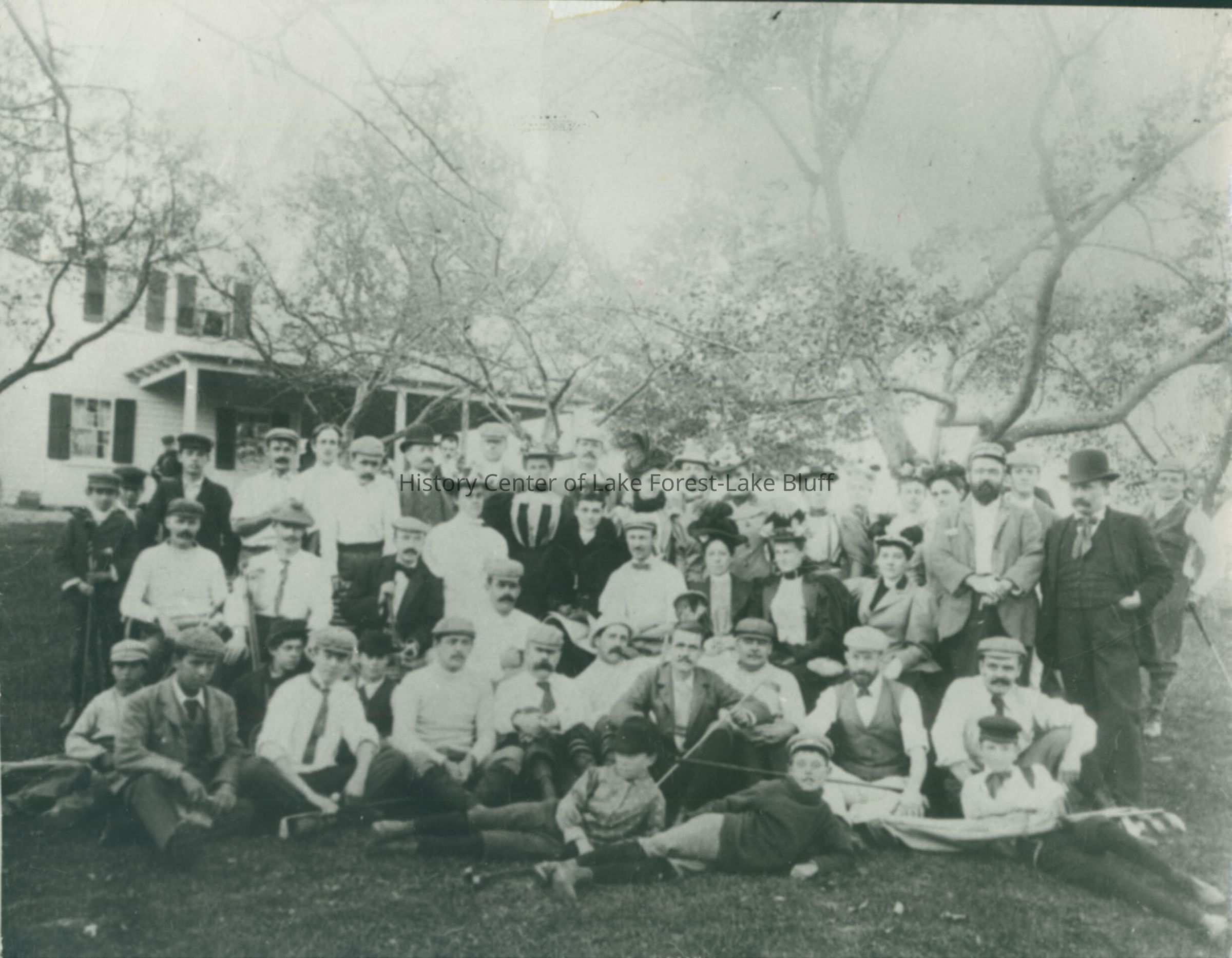 Group of men, women and children posed for photograph with golf clubs in front of two story house with porch. Members of the Lake Forest Golf Club which became the Onwentsia Club.