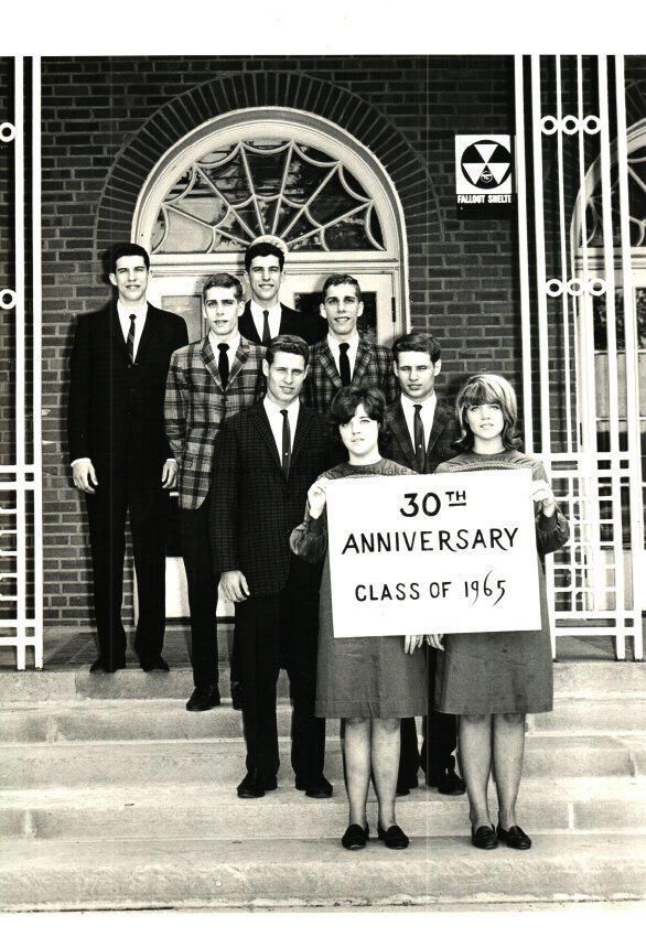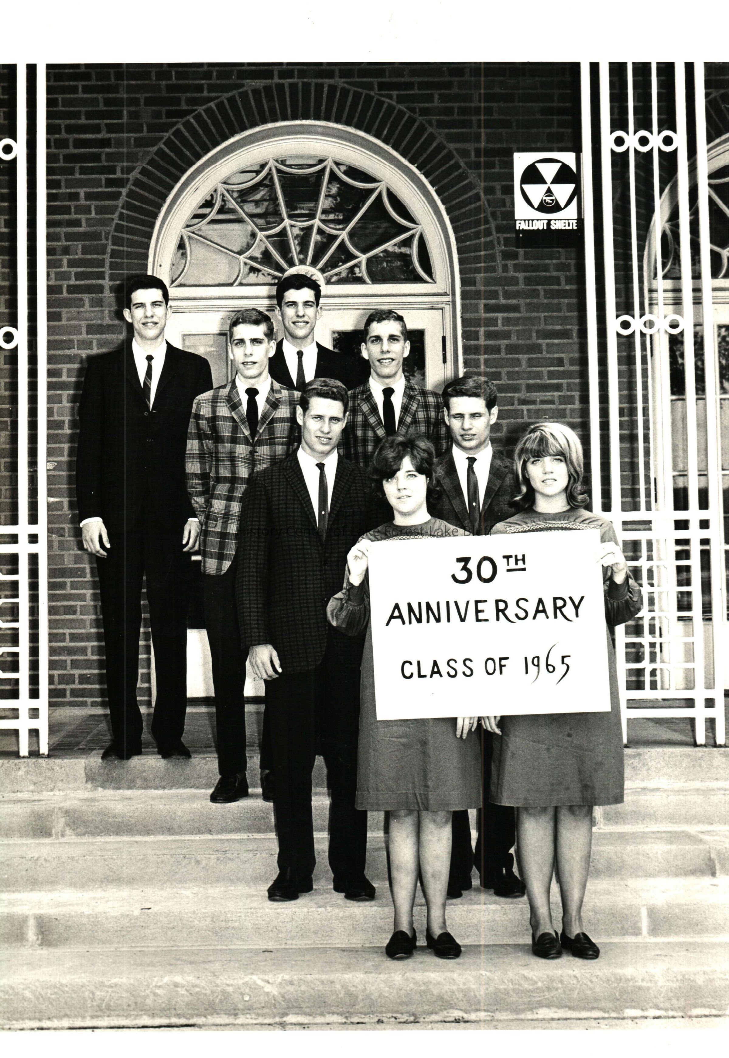 Students stand on the steps holding a sign that says "30th Anniversary....Class of 1965" A