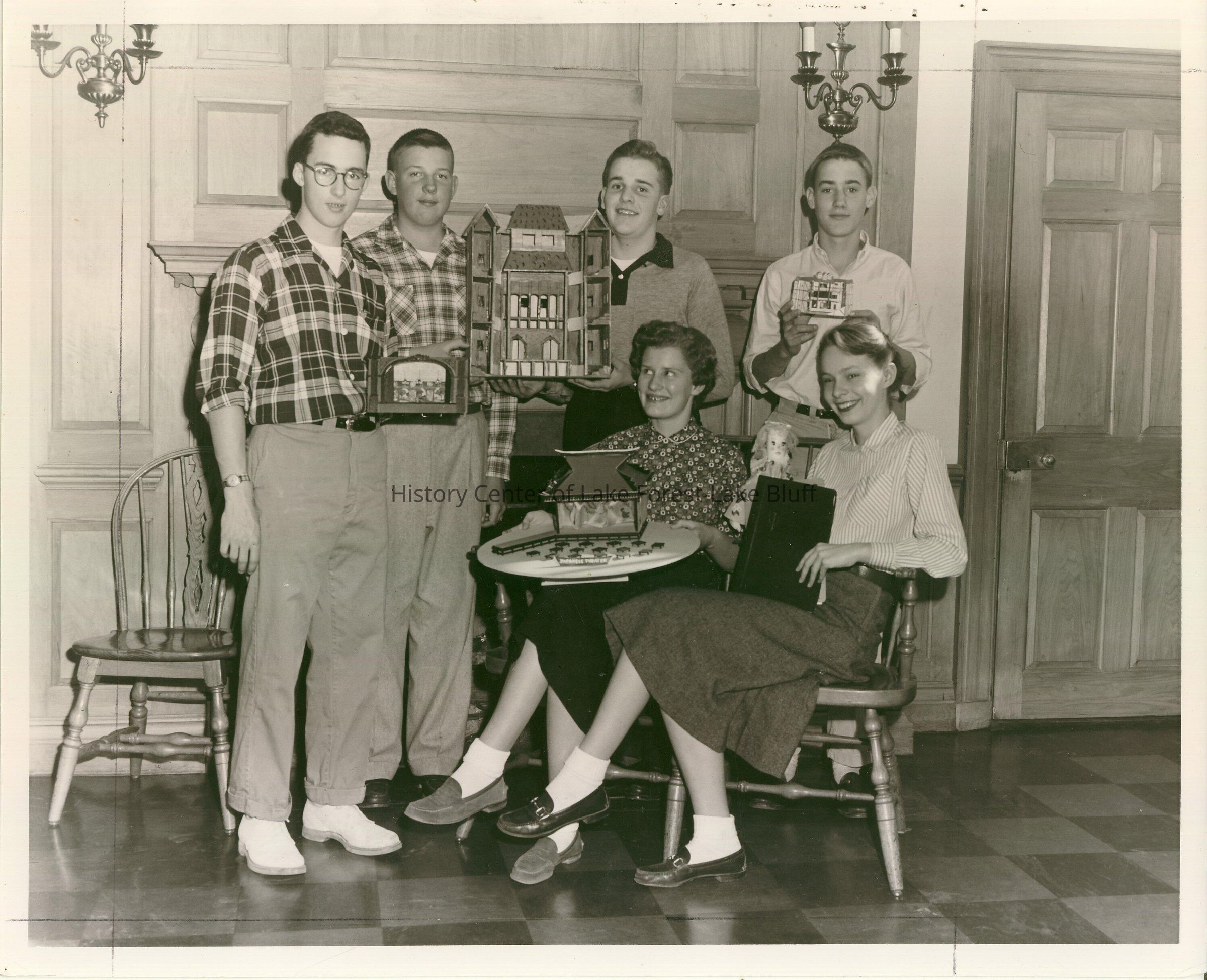 Lake Forest High School students pose with small wooden models of buildings. Lake Forest Co.