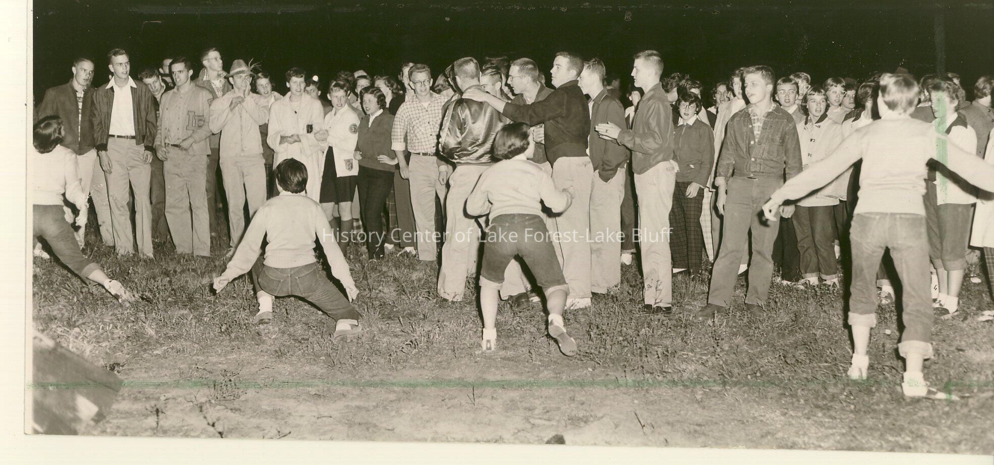 Lake Forester A large group of students gather outside in the evening Stamped on back: "Photo By Dick Phillips 585 W. Deerpath Lake Forest, ILL"