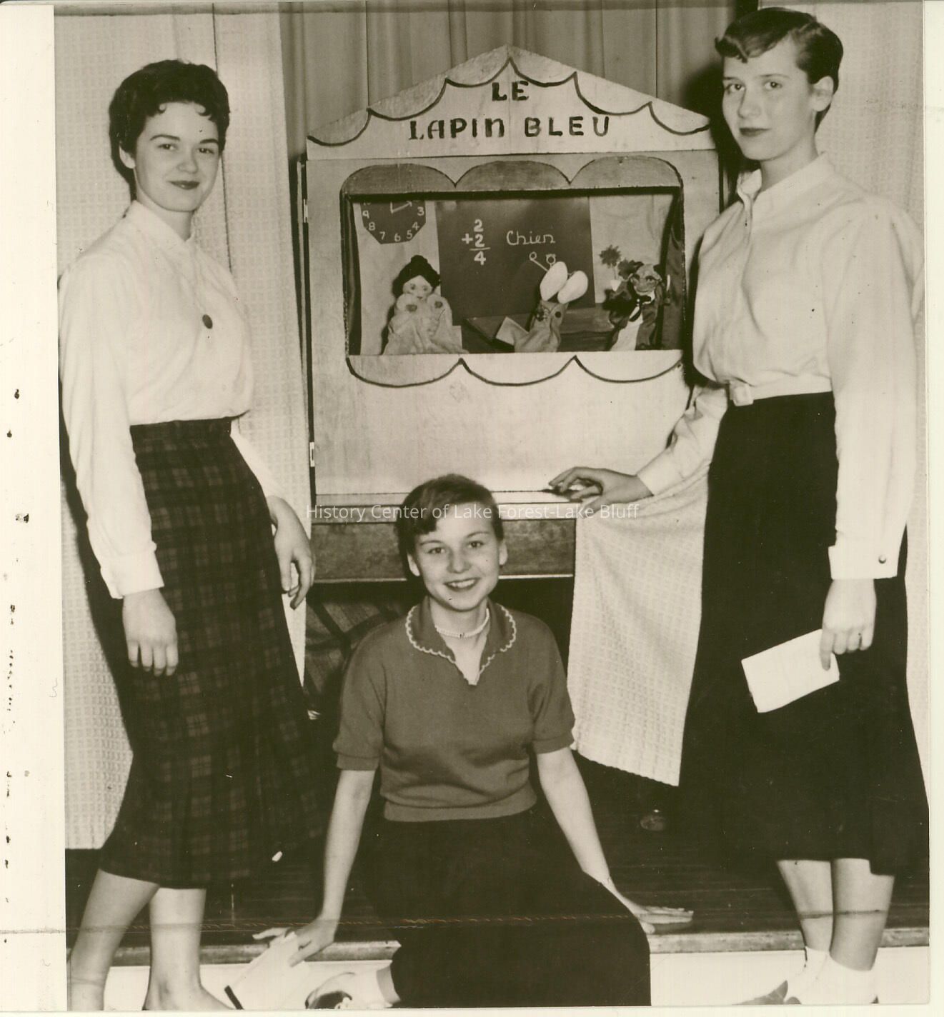 Three girls pose with a puppet show