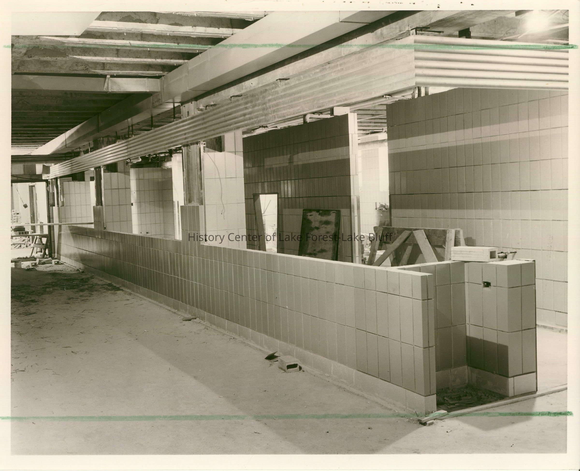 Lake Forest High School Cafeteria under construction Lake Forester stamped on back: "Photo By Dick Phillips 585 W. Deerpath Lake Forest, ILL."