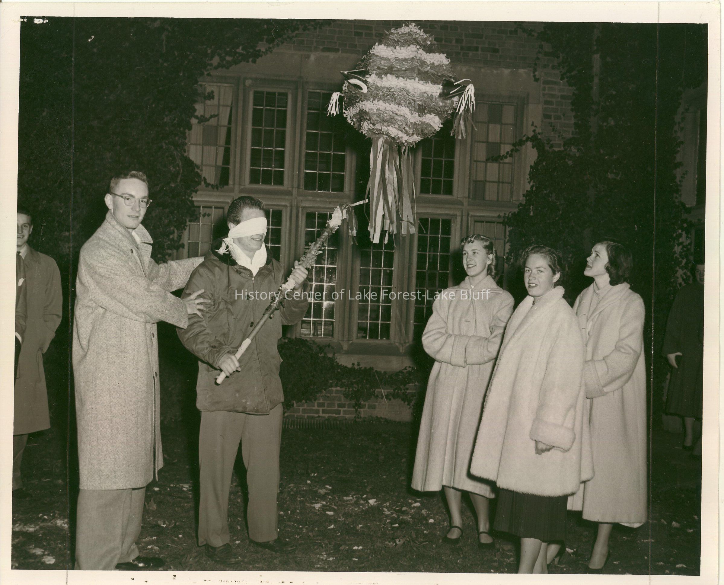 Students stand outside beneath a pinata