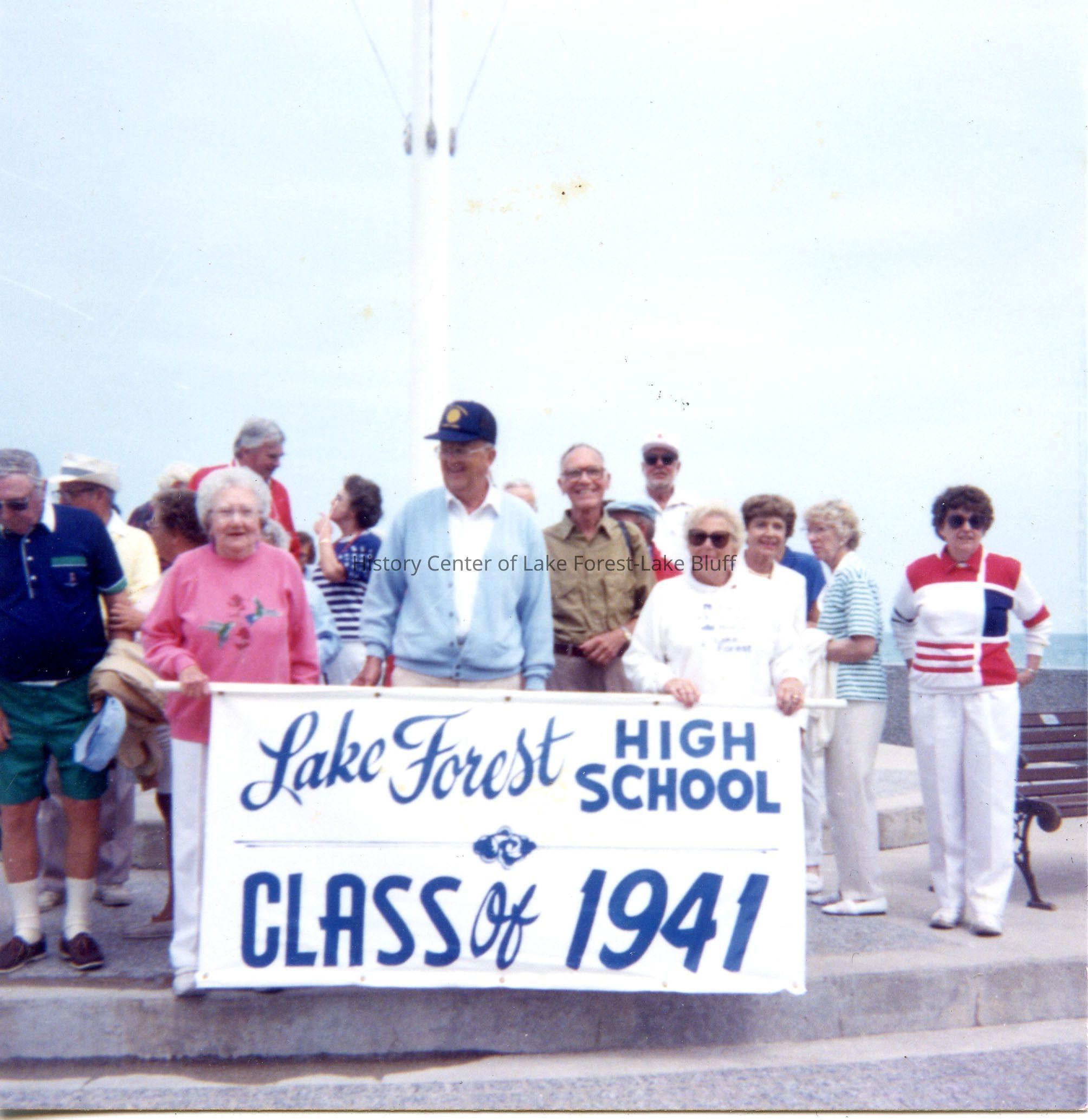 Group holding "Lake Forest High School Class of 1941" banner, at Lake Forest beach, at a reunion. (50th? 60th?)