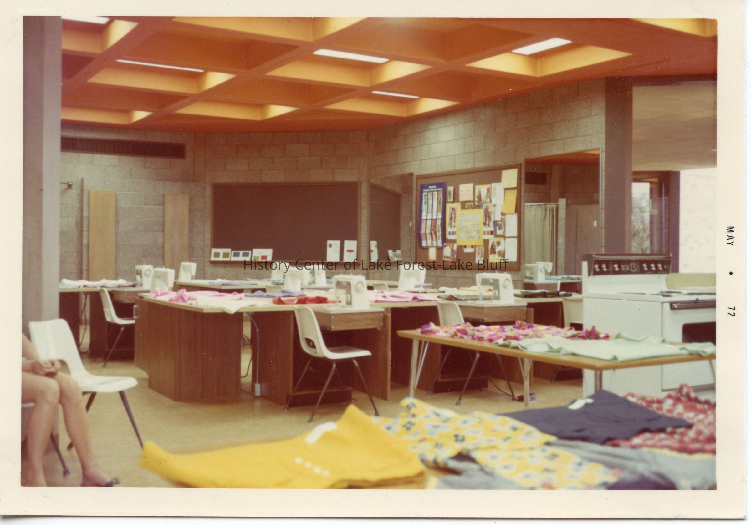 Interior of Lake Forest High School West Campus. Sewing machines and stoves are visible. Likely the home economics room. Color photograph dated May 1972.