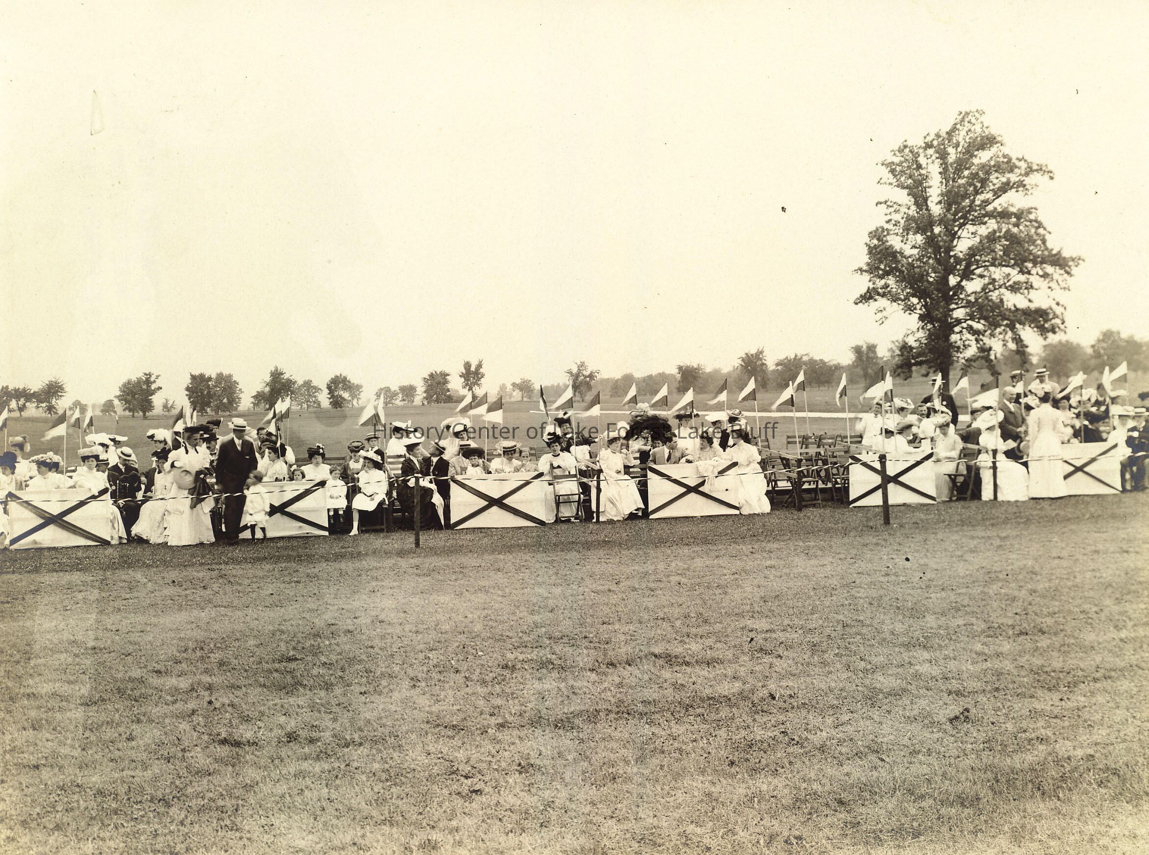 Black and white sepia toned photograph of the Lake Forest Horse Show. Image shows ladies and gentlemen seated in sections. Most of the ladies are wearing white dresses and hats, while the men are wearing summer suits and hats. Verso in pencil hand written " LF Horse Show 1910- ? or polo at Ferry Field? (1885) Grace Tuttle Chandler in 1984 said this is a view of 'Ferry Field' which extended from Spruce Ave. to the ravine north to 'Ferry Woods.' There were brick 'pillars' on either side of Sheridan Rd. marked 'Ferry Field' and 'Ferry Woods' in cement. Polo first was played on Ferry Field before Onwentsia. Bertha Durand Yaggy informed Katherine Arpee of this in 1970"