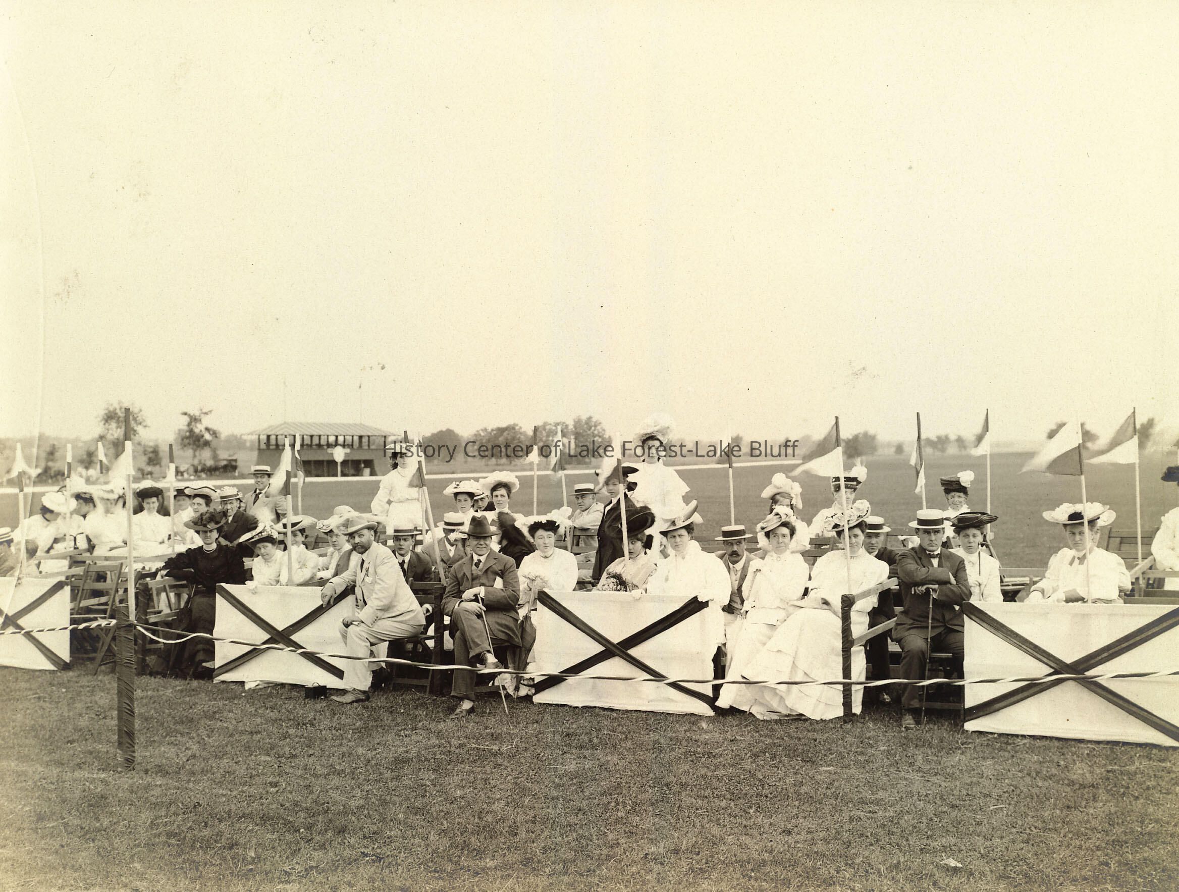 Black and white sepia toned photograph of the Lake Forest Horse Show. Image shows ladies and gentlemen seated in sections. Most of the ladies are wearing white dresses and hats, while the men are wearing summer suits and hats. A negative of image is included.