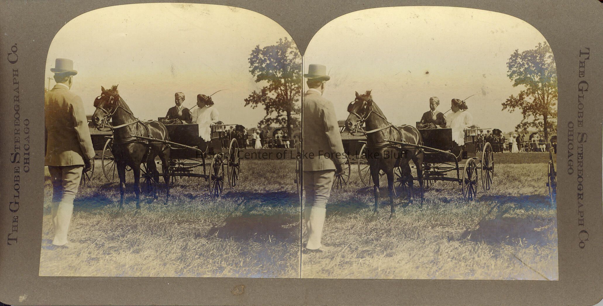 Stereograph of single horse drawn buggy with a boy and a girl in it. Man with back to camera at horse's head. Lake Forest Horse Show.