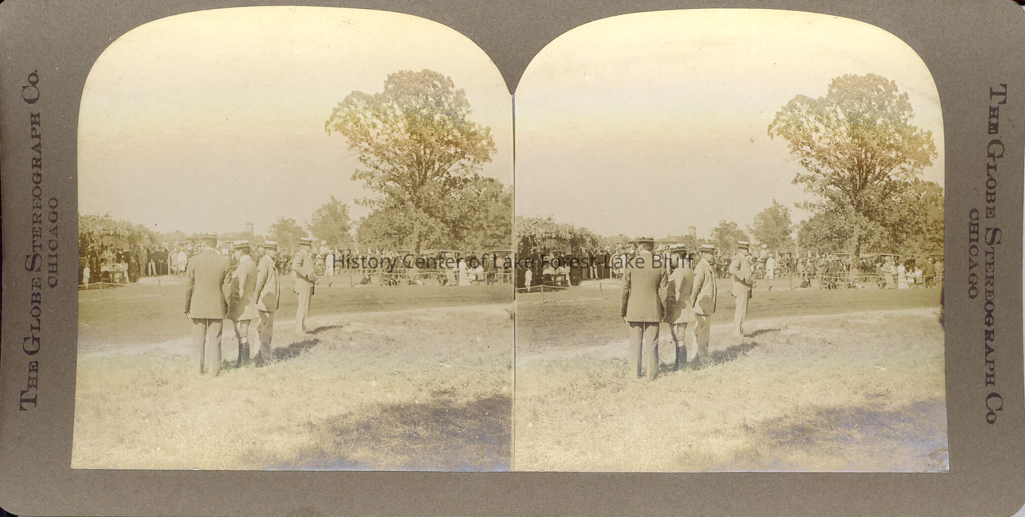 Stereograph of field with trees in background. Four men in suits in foreground. Lake Forest Horse Show.
