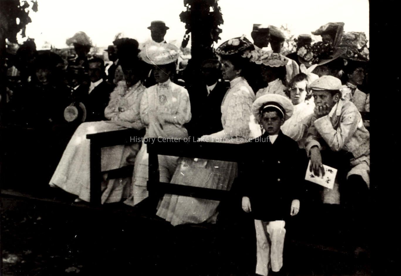 Black and white toned photograph of the Lake Forest Horse Show. Women, girls and a few men are shown seated in the boxes at the horse show. A young boy in a sailor suit is standing looking at the photographer. Verso: A. B. Dick box.