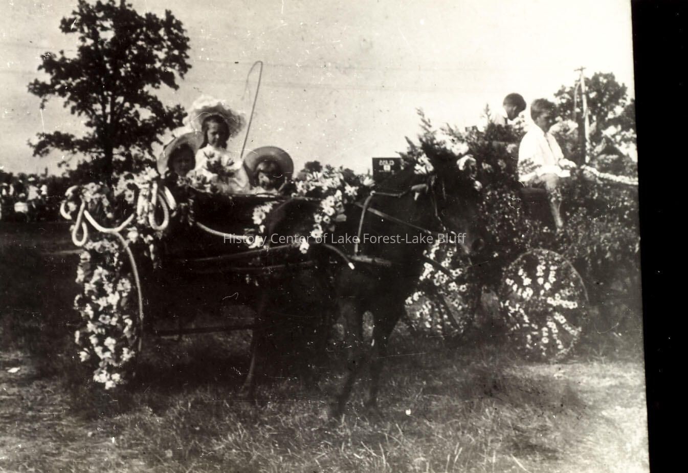 Black and white toned photograph of the Lake Forest Horse Show. Children seated in an elaborate cart decorated with garlands and flowers on the the wagon wheels. Verso: Judging decorated pony carts.