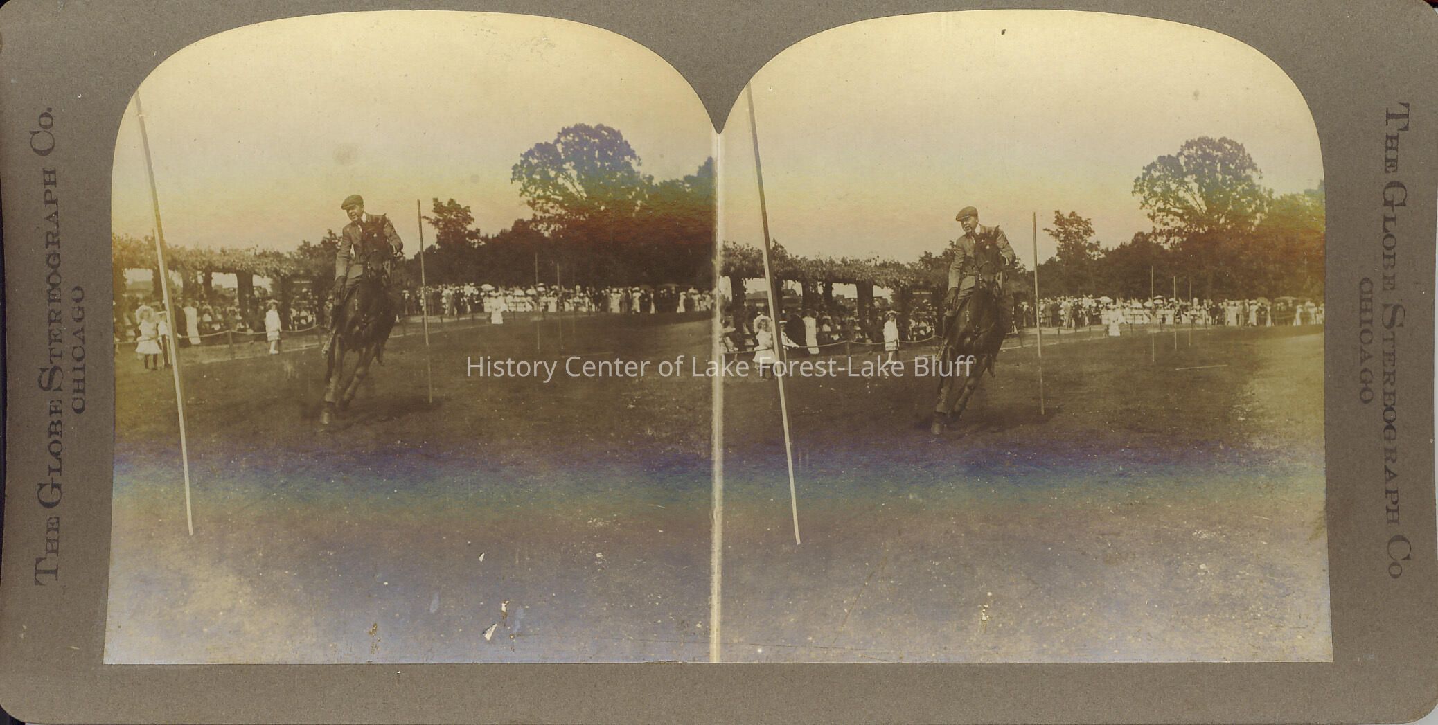 Stereograph of field with trees and crowd in background. Mounted rider running through agility poles. Lake Forest Horse Show.