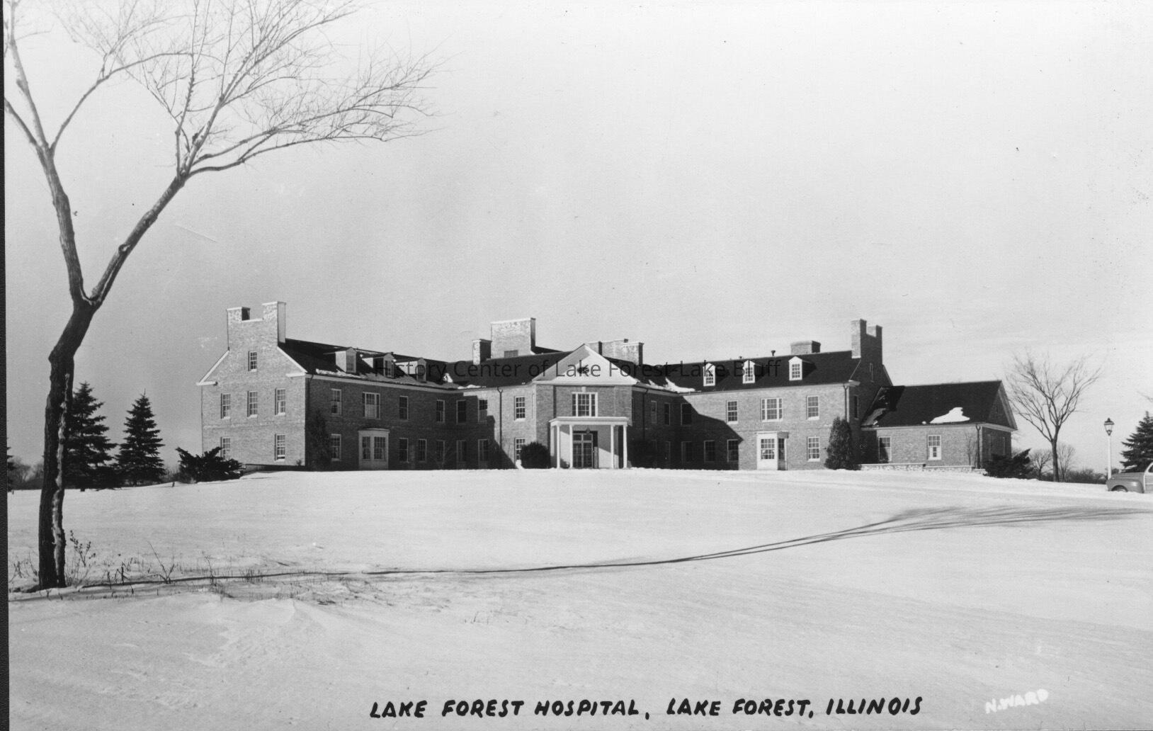 Postcard of Lake Forest Hospital in winter with snow on ground c. 1950