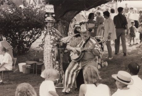 A festive outdoor gathering features performers in costumes entertaining a crowd with music and lively antics under a tree.