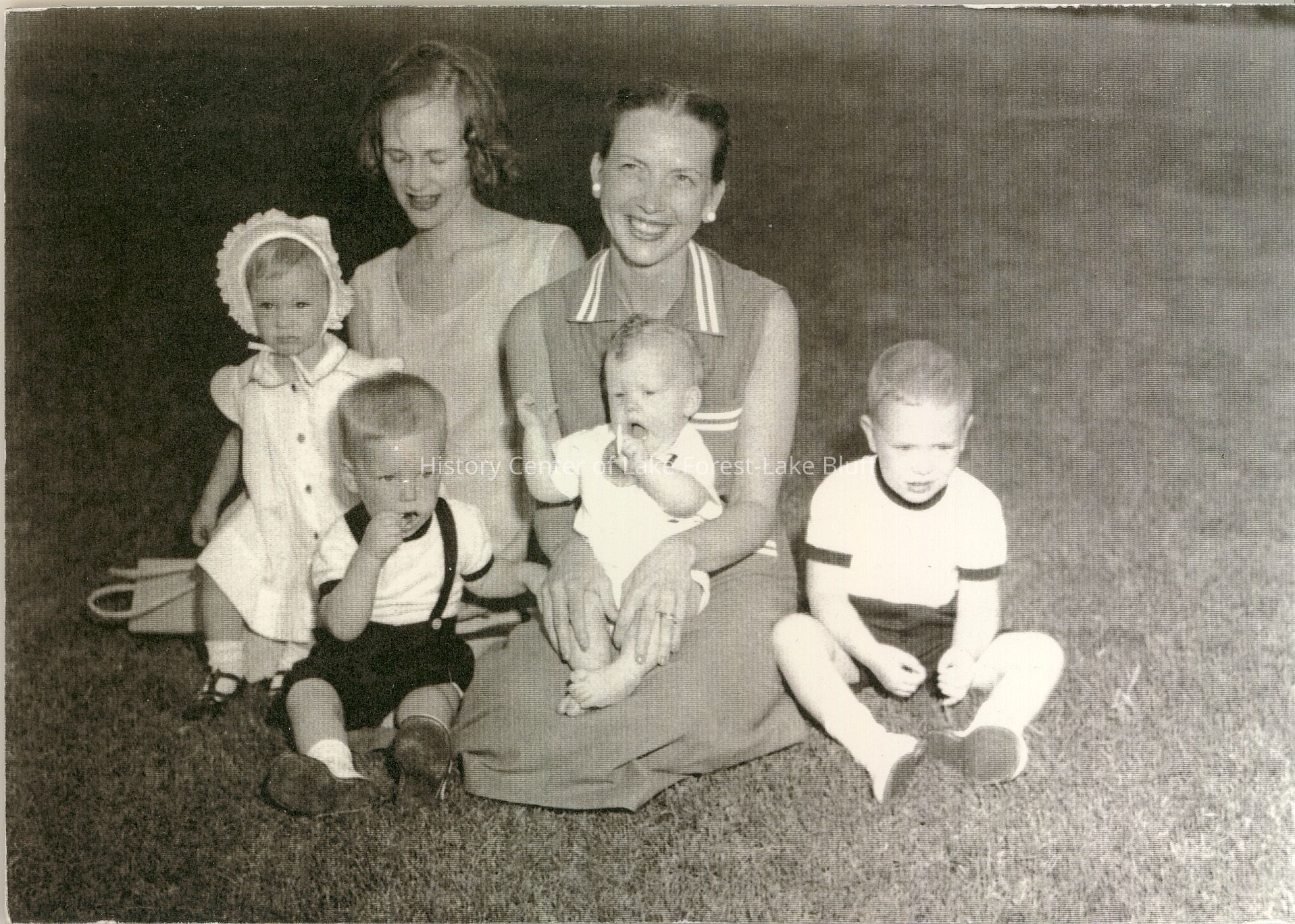Two women are sitting on grass, surrounded by four children, smiling together.