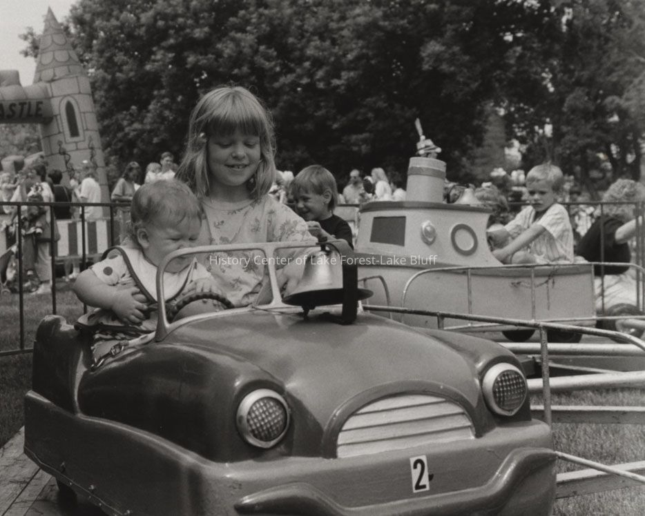 Two children enjoy a carousel ride, sitting in a small car, surrounded by other smiling kids and adults