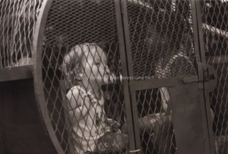 A young child is sitting inside a large metal cage, observing the surroundings curiously, illuminated by soft