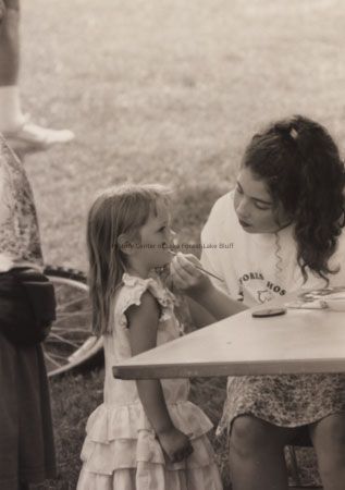 A young woman, seated by a table, does face painting