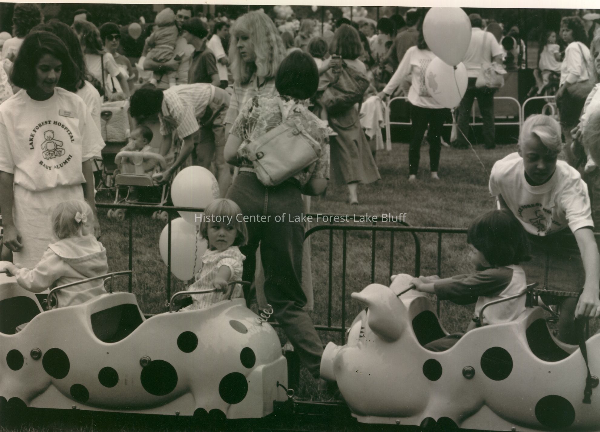 Children ride in a polka dot train while adults and balloons fill the grassy background scene.