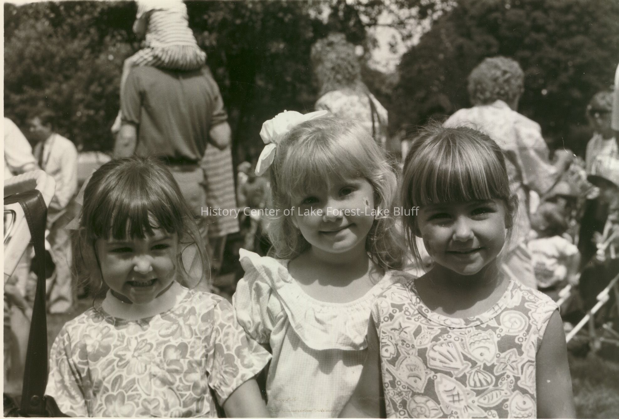 Three young girls smile sweetly at the camera, dressed in patterned summer dresses at an outdoor gathering.