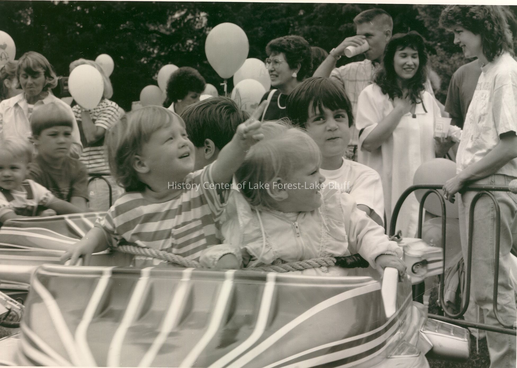 Children joyfully ride a carnival attraction while holding balloons, surrounded by smiling adults enjoying the event.