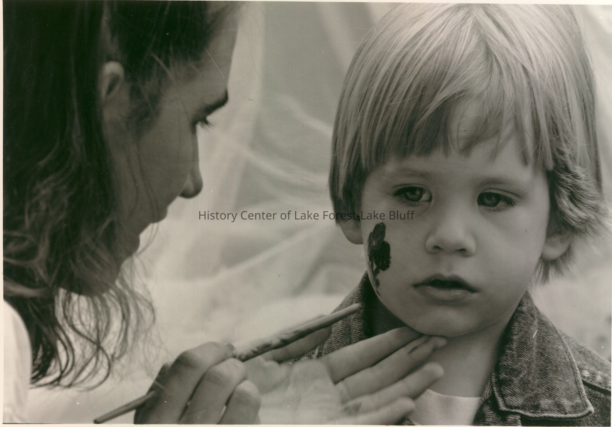 A young child has their cheek carefully painted by a person using a brush.