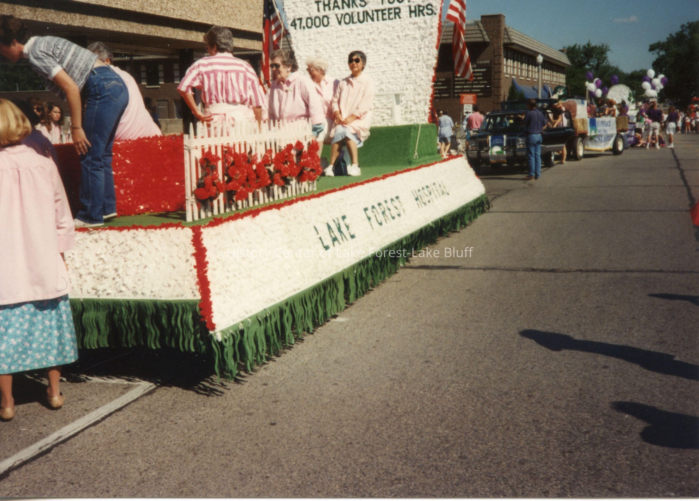 Lake Forest Hospital volunteers on Lake Forest Day parade float. 2 copies.
