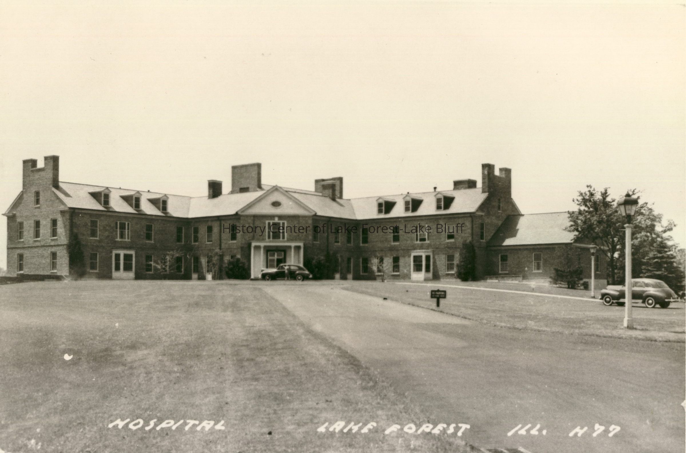 Photographs relating to Lake Forest Hospital collected for the 100th Anniversary of the Hospital by the Development Department. 1940s postcard view of Lake Forest Hospital exterior, 2 cars in the drive