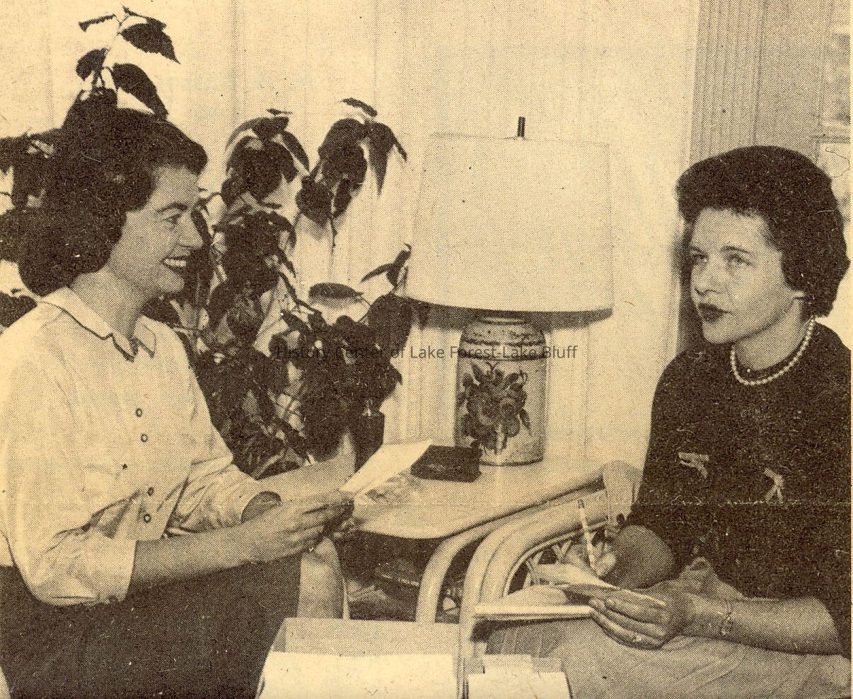 Women's Auxilliary: Mrs. F. Lee Wendell and Mrs. Donald C. Cottrell work on reservations for Onwentsia rummage fashion show.