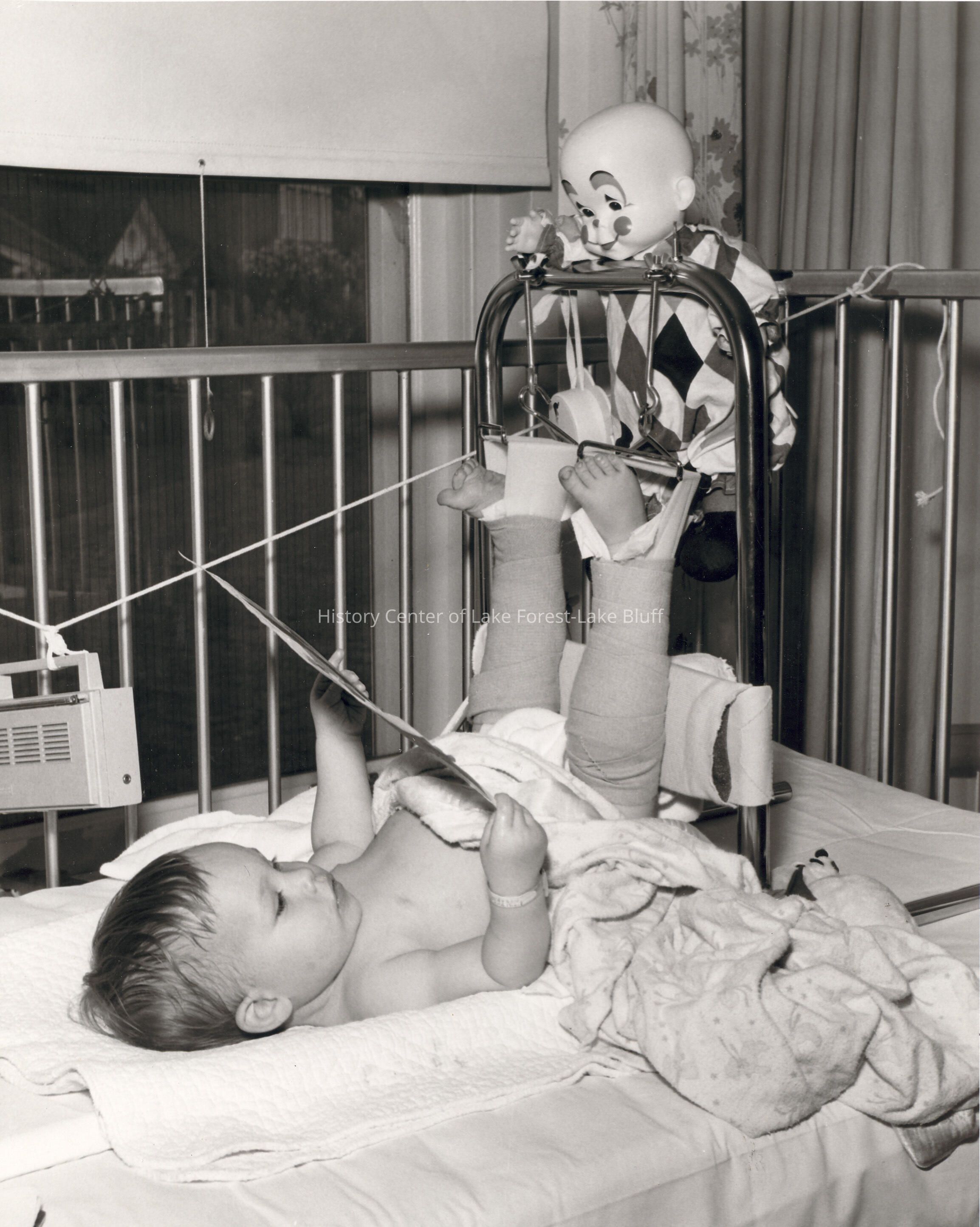 Young boy with legs in casts with clown toy attached to his hospital bed.