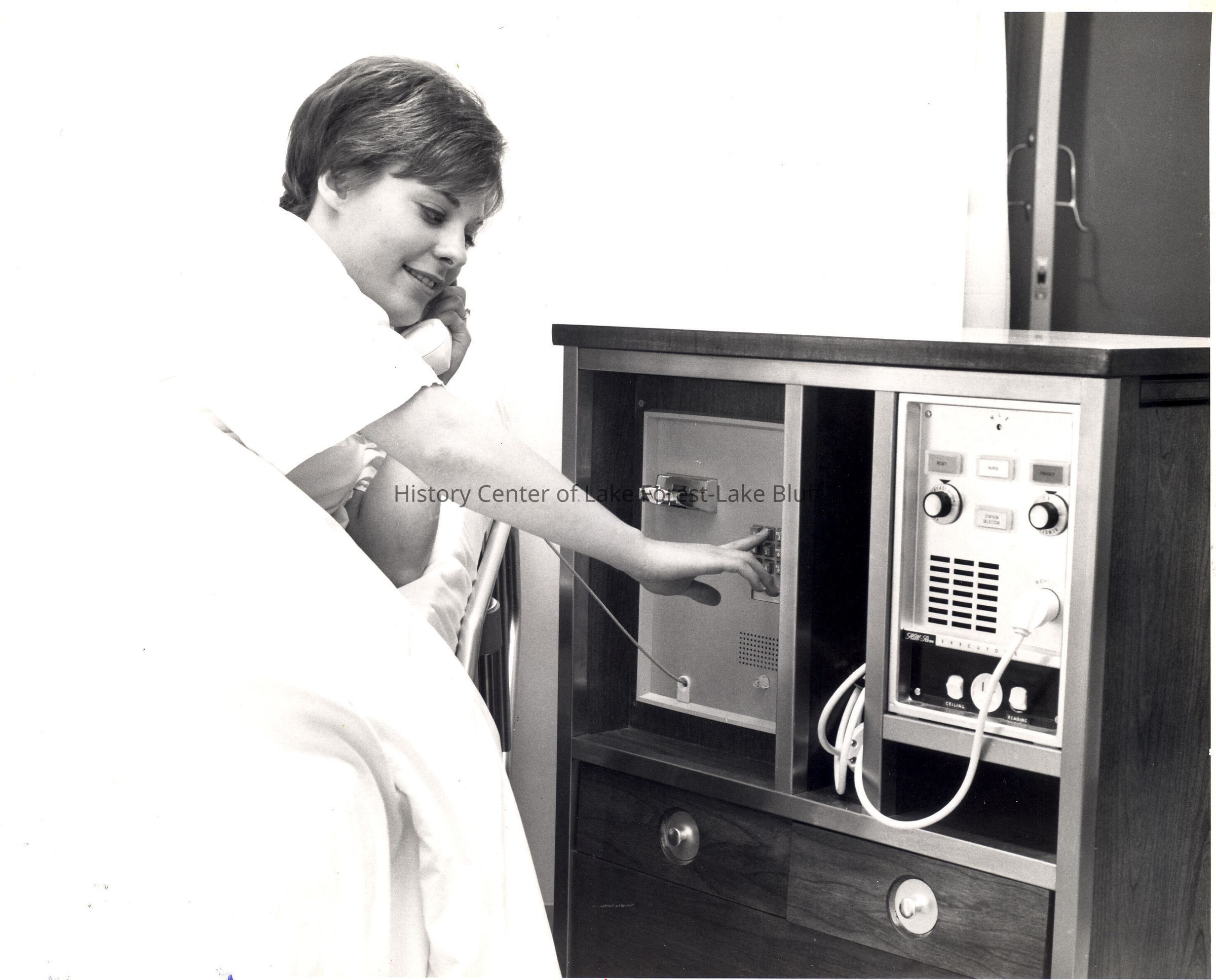 Female patient making phone call from phone console in room.