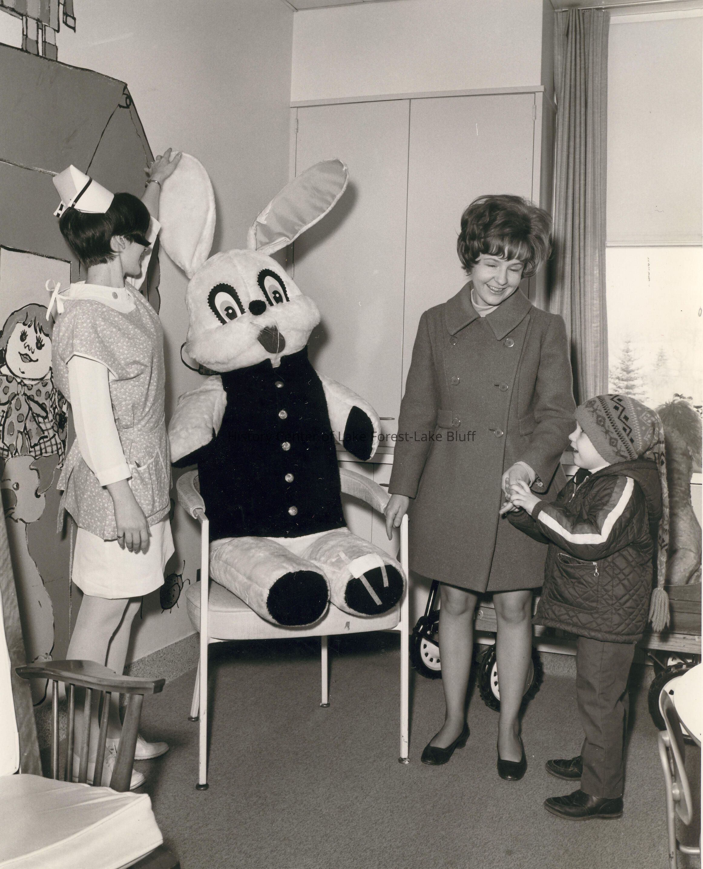 Young boy and his mother and nurse with big stuffed rabbit.