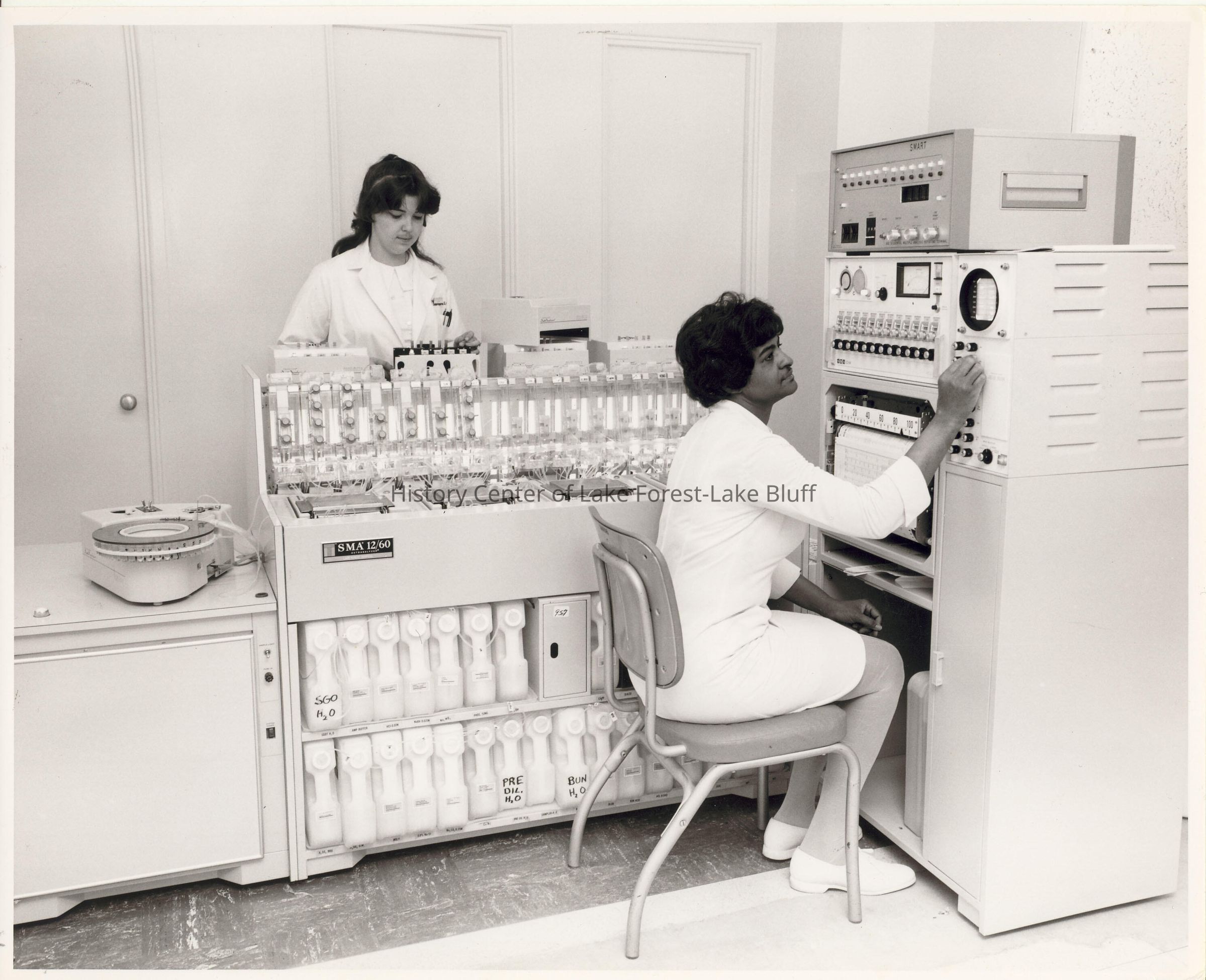 Two technicians presumably typing blood in lab setting. One apparently Mary Casselberry. Blood typing and donation.