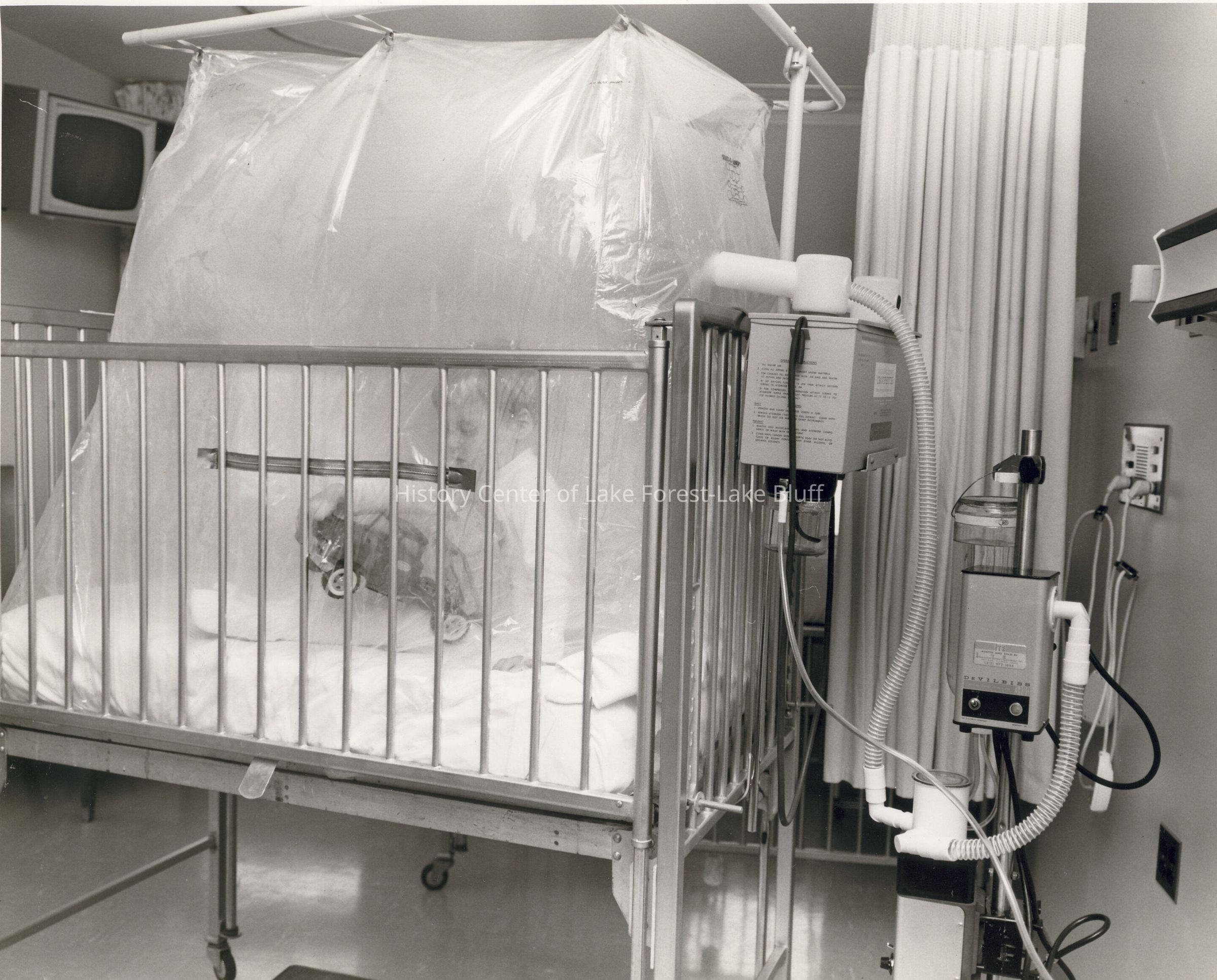 Young boy playing with a toy truck in oxygen tent in crib.