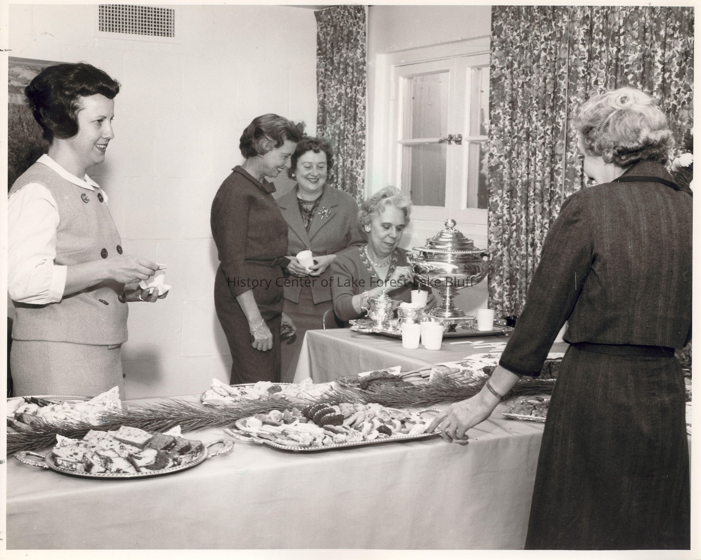 Women's Auxilliary: Women gathered around coffee set and deserts.