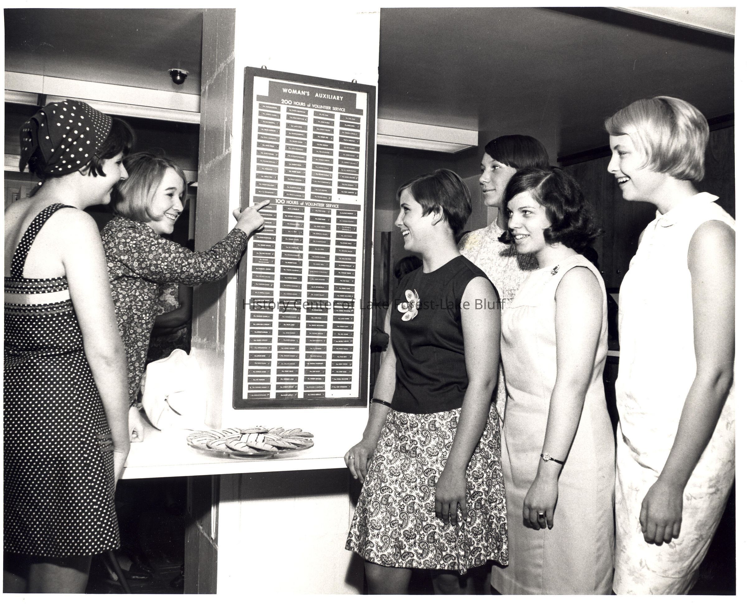 Young ladies, presumably Candy Stripers, looking at list of volunteer hours.