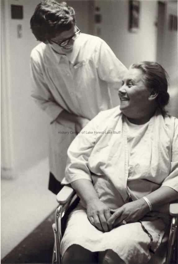 Female volunteer sharing laugh with and pushing female patient in wheel chair.