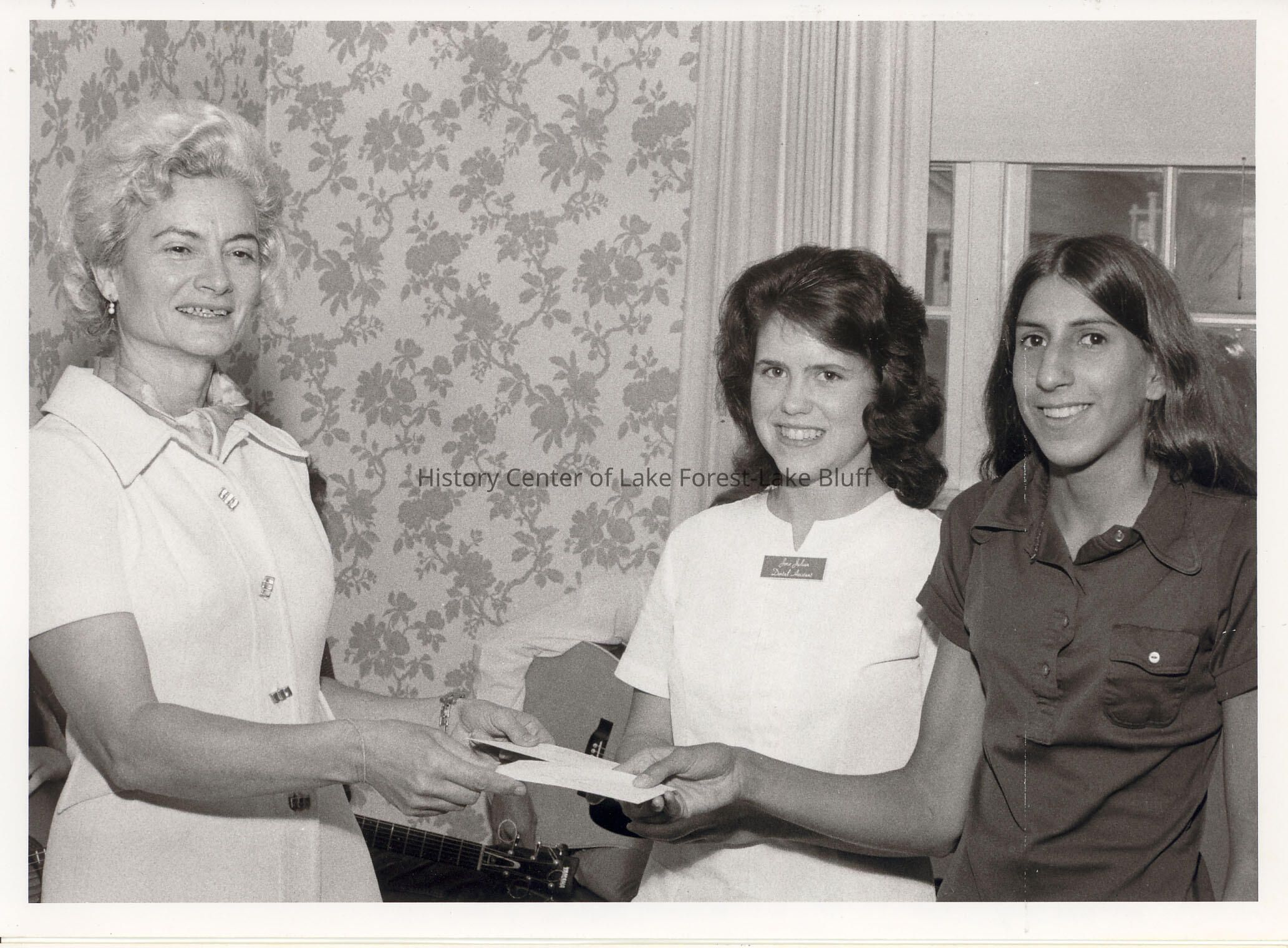 Volunteer Recognition. Ida Stanley, Director of Volunteers handing award to Candy Striper with other woman observing.