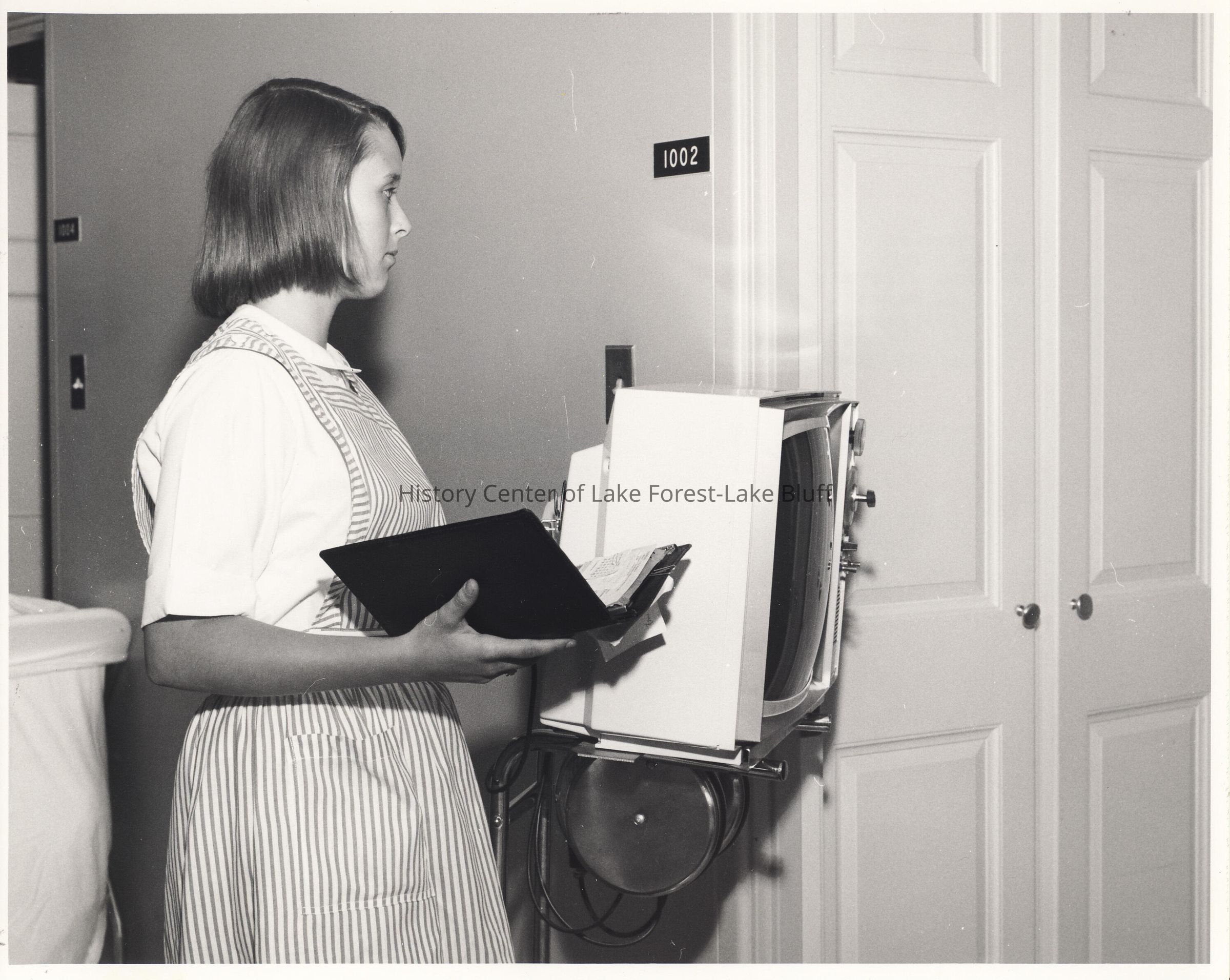 Candy Striper with binder in room 1002.
